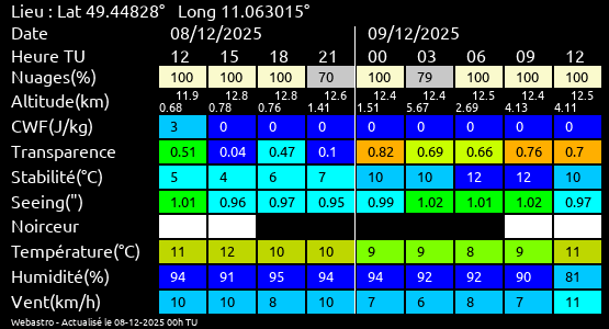 Ces paramètres sont fournis pour la nuit suivante de 12 h TU du jour en cours à 12h TU du jour suivant par pas de 3h.