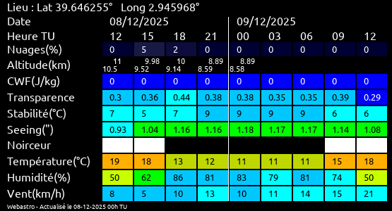 Ces paramètres sont fournis pour la nuit suivante de 12 h TU du jour en cours à 12h TU du jour suivant par pas de 3h.