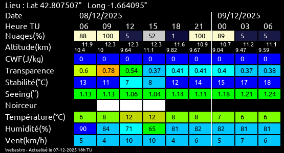 Ces paramètres sont fournis pour la nuit suivante de 12 h TU du jour en cours à 12h TU du jour suivant par pas de 3h.