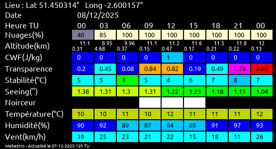 Ces paramètres sont fournis pour la nuit suivante de 12 h TU du jour en cours à 12h TU du jour suivant par pas de 3h.