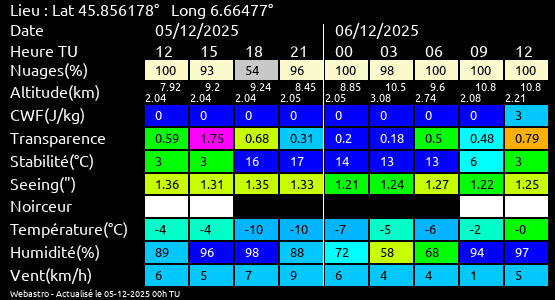 Ces paramètres sont fournis pour la nuit suivante de 12 h TU du jour en cours à 12h TU du jour suivant par pas de 3h.