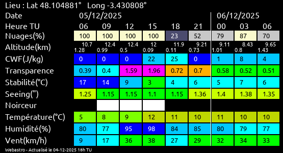 Ces paramètres sont fournis pour la nuit suivante de 12 h TU du jour en cours à 12h TU du jour suivant par pas de 3h.
