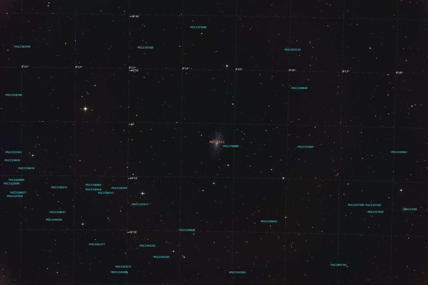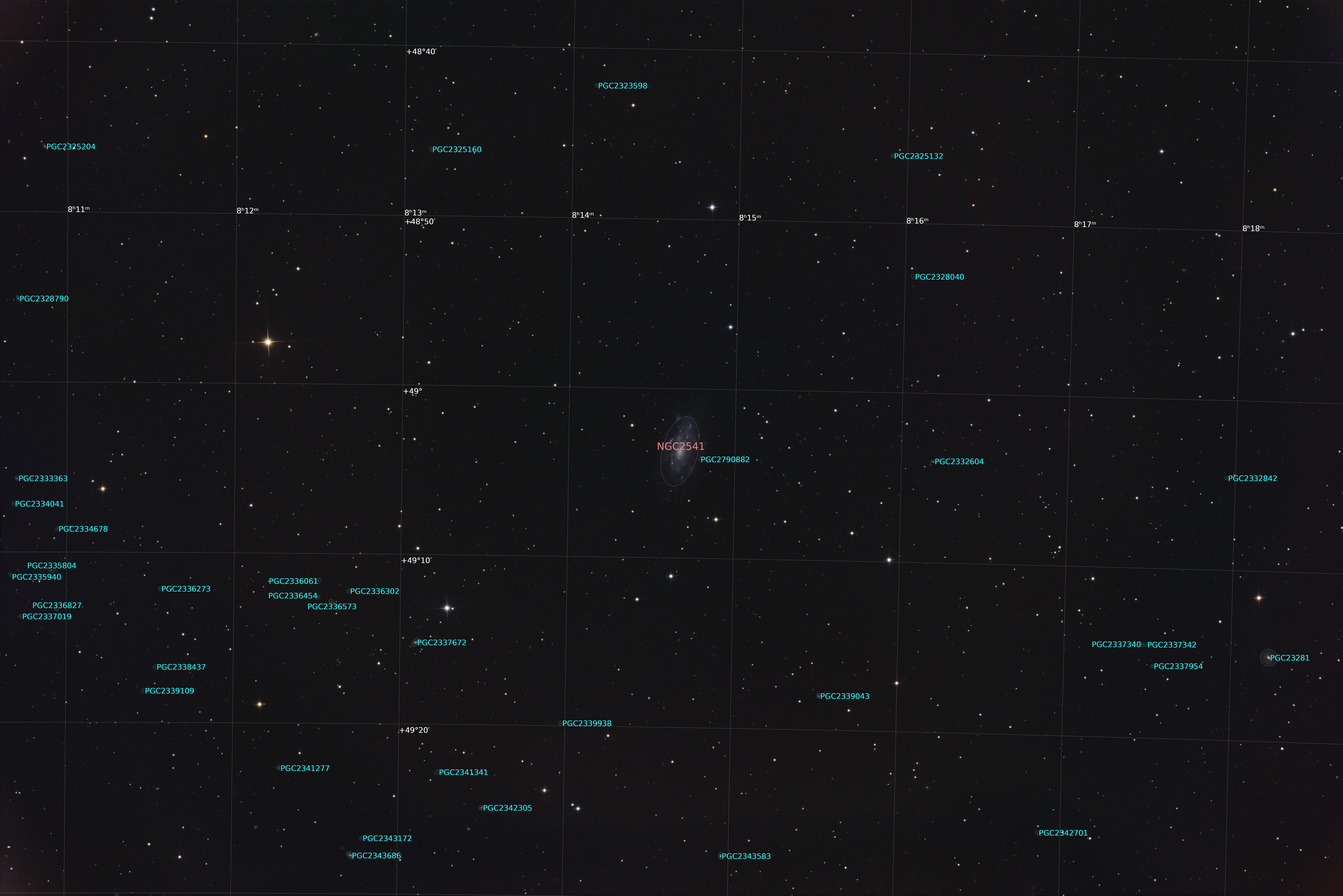 Salut, toute fraiche de cette nuit en première partie: NGC 2541🤘 J'ai pris 30 poses de 240Sec avec l'ASI6200MC sur un T 350 F4.6 ce qui n'est vraiment pas assez car sa brillance surfacique est très faible (mais bon, je dormais🫢). La nuit aura été très productive puisque j'ai pu faire: NGC1169 IC239 & NGC1023 NGC2541 NGC3079 Bref, place aux images, la crop: la full: et la version annotée a+ Serge