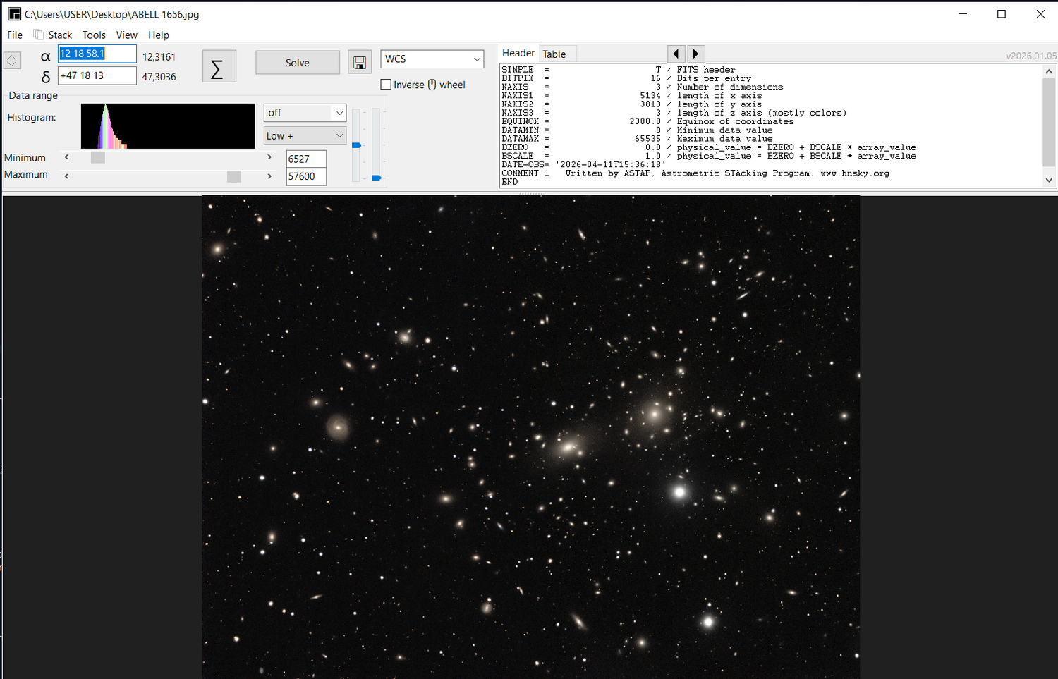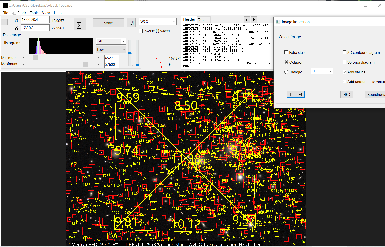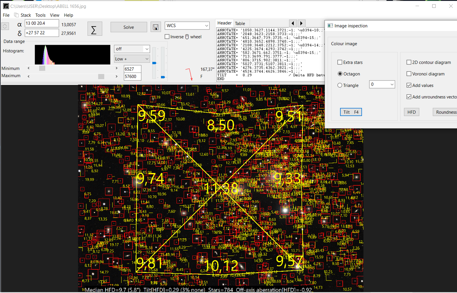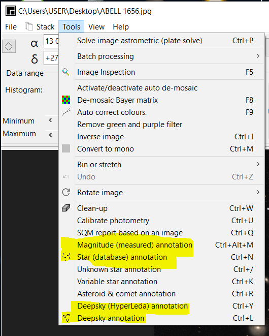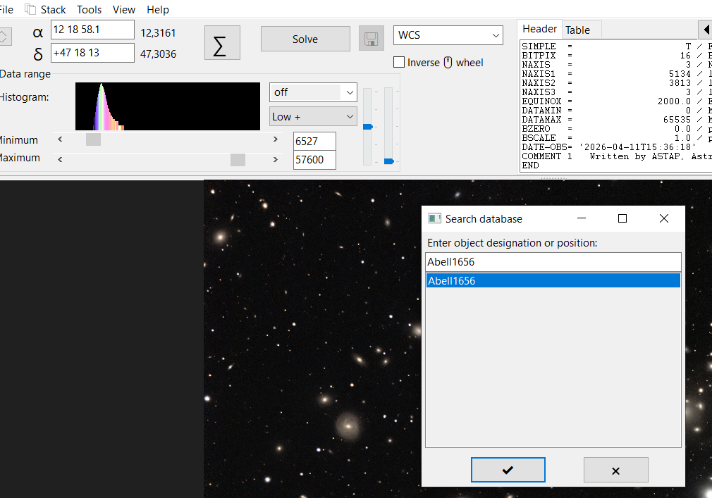 Sur le site ASTAP: https://www.hnsky.org/astap.htm Installer les bdd D80 et Hyperleda: Ensuite dans ASTAP charger ton image: Cl icdroit ici (là où il a les coordonnées) pour préciser ta cible: abell 1656 Faire la résoltuion astrométrique: bouton SOLVE Résolution faite (ça a pris du temps) Dans "Tools" tu as ce qu'il faut: une fois que tu as l'image annotée, tu peux faire: File puis save as jpeg par exemple. voici les différentes infos: Hyperleda: Deepsky Magnitude Etoiles: J'ai pas mis toutes les annotations ensembles sinon on ne voit plus rien Et toujours dans Tools, tu peux voir si ton train optique est dans l'axe ou s'il y a du tilt: Tools, Image inspection Yapluka -