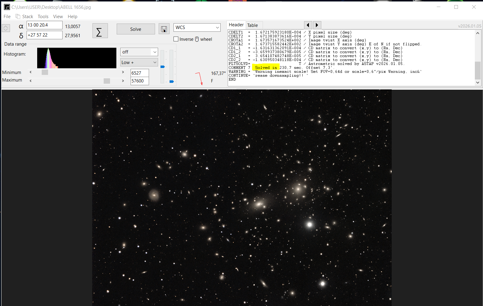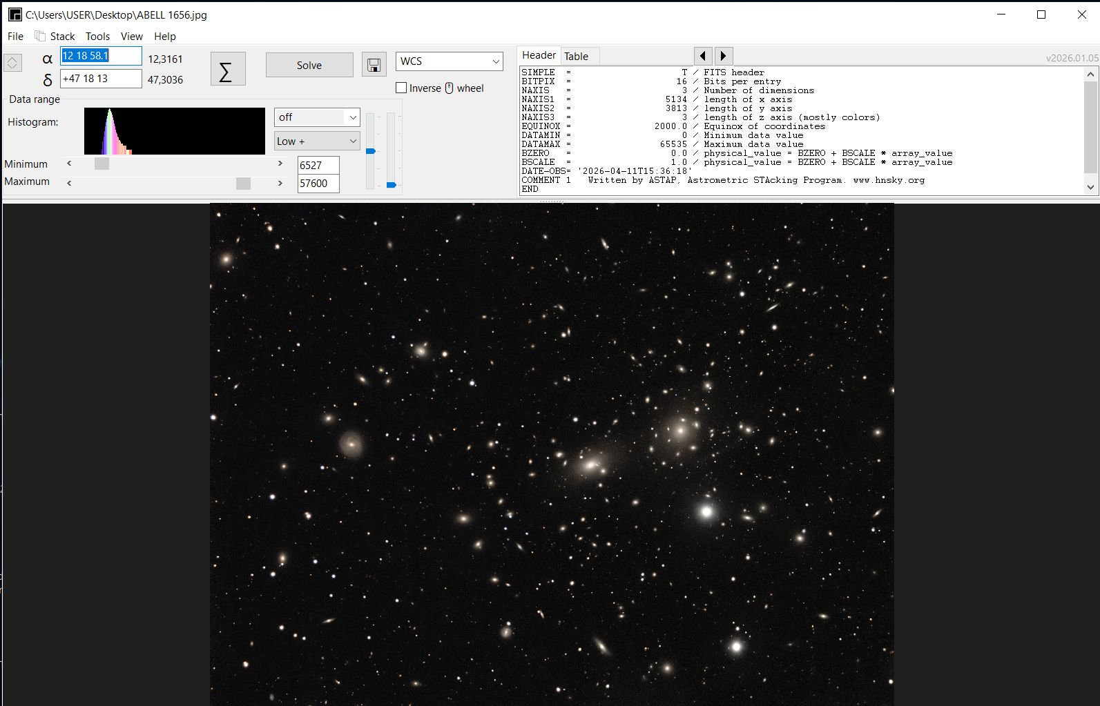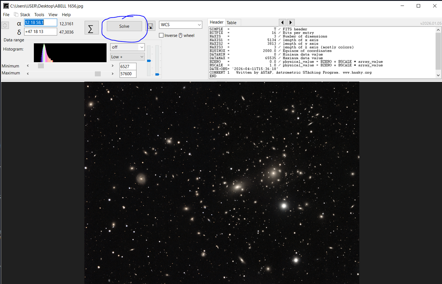 Sur le site ASTAP: https://www.hnsky.org/astap.htm Installer les bdd D80 et Hyperleda: Ensuite dans ASTAP charger ton image: Cl icdroit ici (là où il a les coordonnées) pour préciser ta cible: abell 1656 Faire la résoltuion astrométrique: bouton SOLVE Résolution faite (ça a pris du temps) Dans "Tools" tu as ce qu'il faut: une fois que tu as l'image annotée, tu peux faire: File puis save as jpeg par exemple. voici les différentes infos: Hyperleda: Deepsky Magnitude Etoiles: J'ai pas mis toutes les annotations ensembles sinon on ne voit plus rien Et toujours dans Tools, tu peux voir si ton train optique est dans l'axe ou s'il y a du tilt: Tools, Image inspection Yapluka -