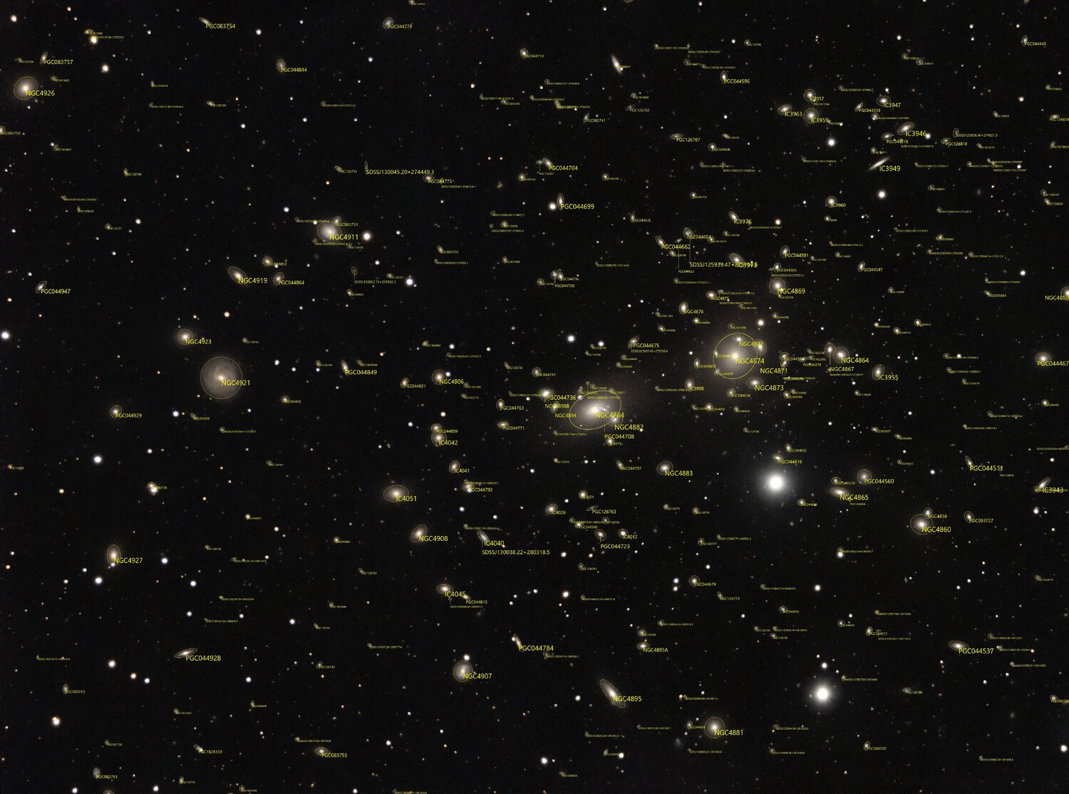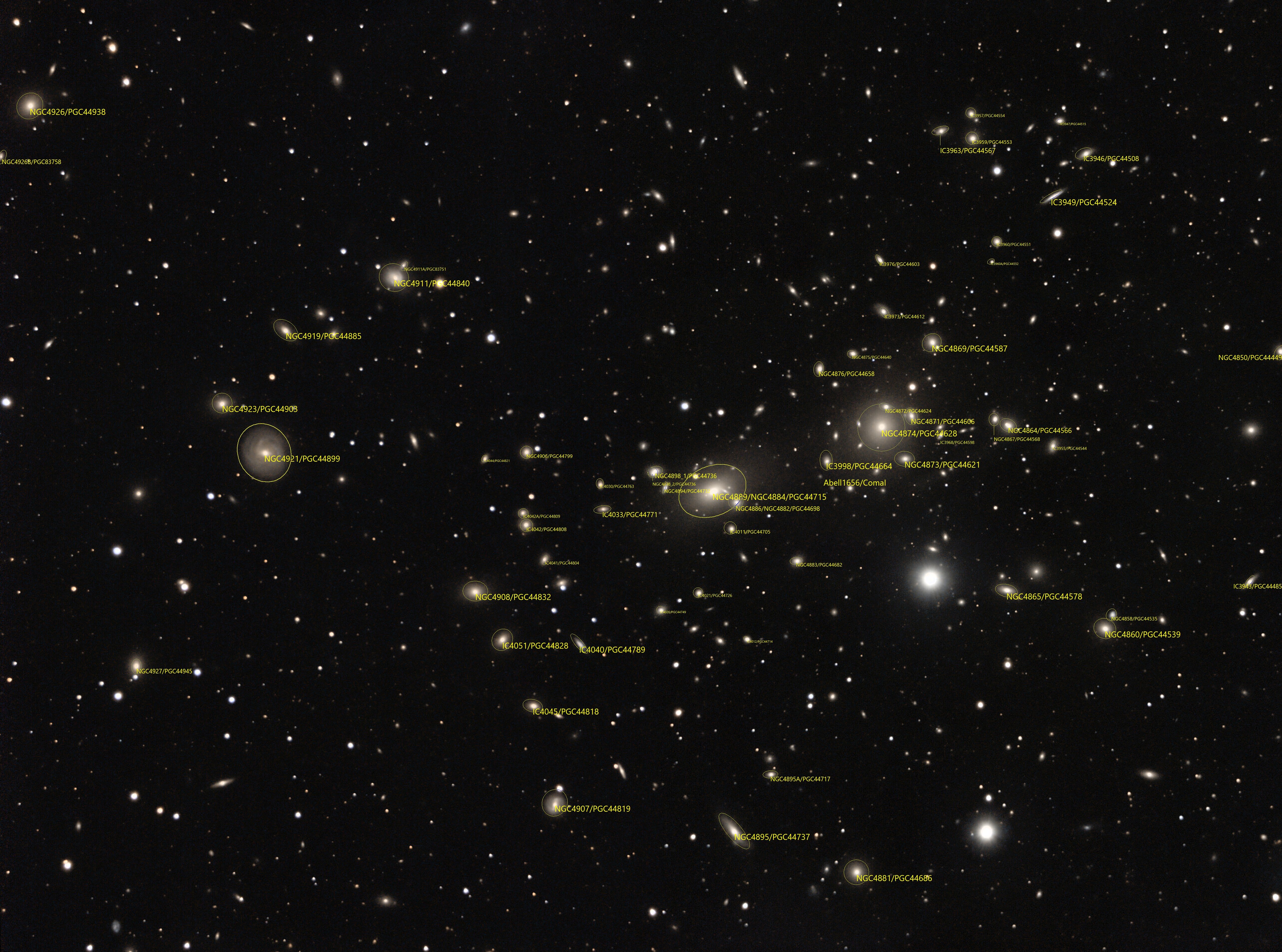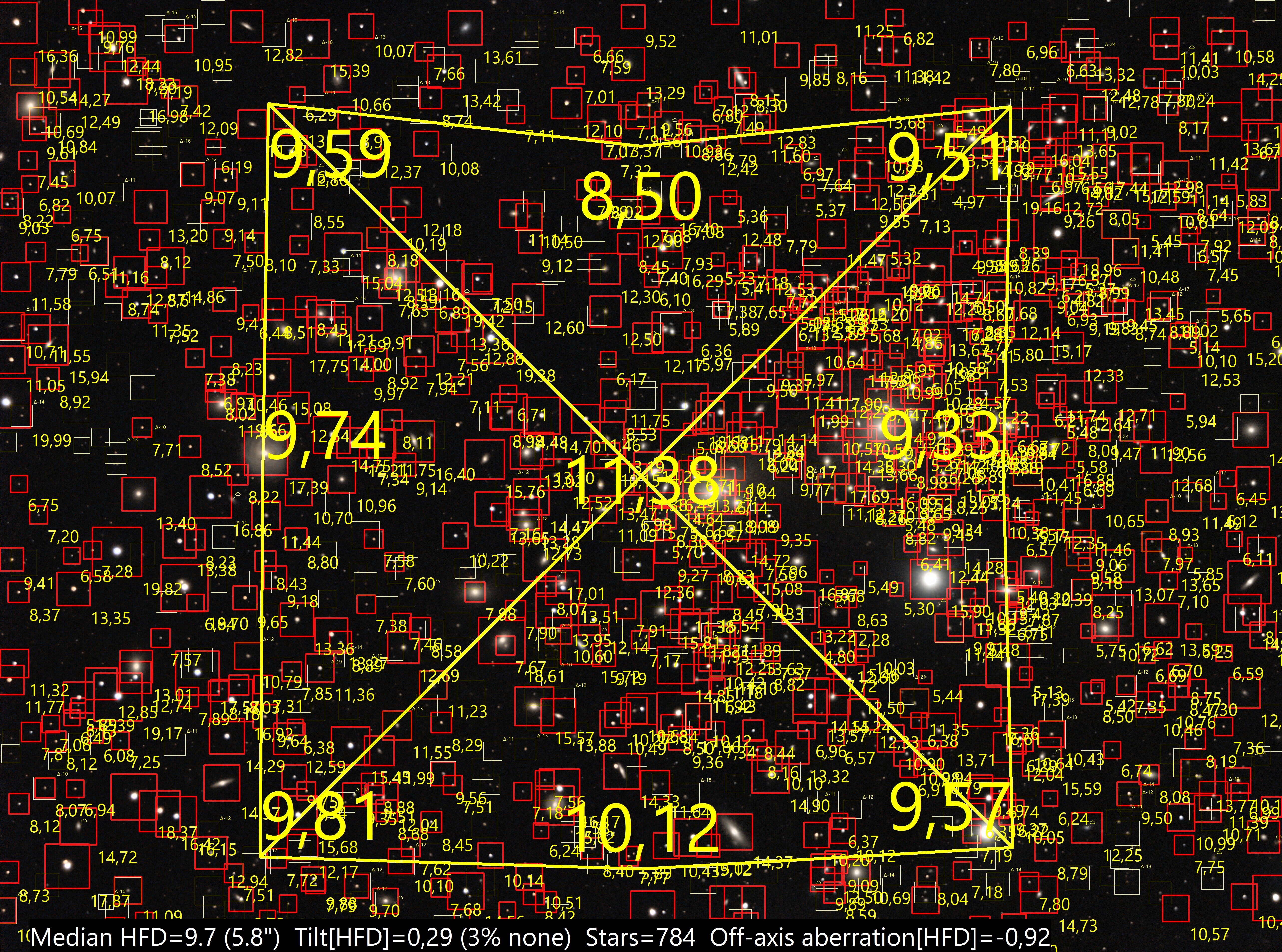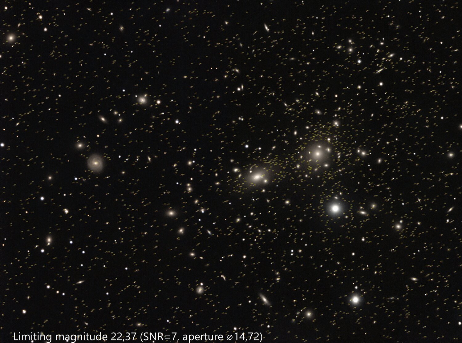 Sur le site ASTAP: https://www.hnsky.org/astap.htm Installer les bdd D80 et Hyperleda: Ensuite dans ASTAP charger ton image: Cl icdroit ici (là où il a les coordonnées) pour préciser ta cible: abell 1656 Faire la résoltuion astrométrique: bouton SOLVE Résolution faite (ça a pris du temps) Dans "Tools" tu as ce qu'il faut: une fois que tu as l'image annotée, tu peux faire: File puis save as jpeg par exemple. voici les différentes infos: Hyperleda: Deepsky Magnitude Etoiles: J'ai pas mis toutes les annotations ensembles sinon on ne voit plus rien Et toujours dans Tools, tu peux voir si ton train optique est dans l'axe ou s'il y a du tilt: Tools, Image inspection Yapluka -
