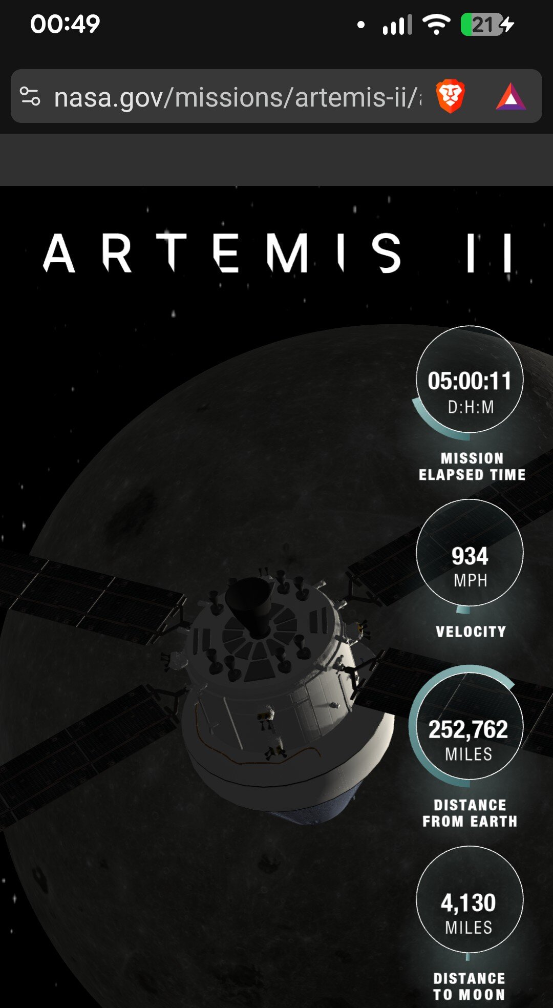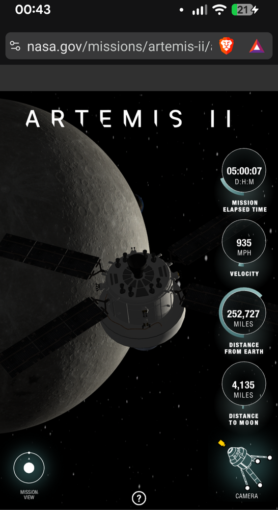 On s'approche, on s'approche... Quelqu'un sait jusq'à combien? J'aimerais pas louper le moment de bascule 🙂 4,8 miles à présent 👀 Ok faut 252 760 miles de la Terre Là on est à 252 460, avant mon édit à 252 311, c'est pour bientôt 😎✨ On voit la Terre en croissant au-dessous du panneau de droite 🙂 Elle disparaît derrière la Lune ✨👀 À 252 762 miles de la Terre, l'appli bug, on doit y être au max 🙂 Bonne nuit les Terriens 😴 -