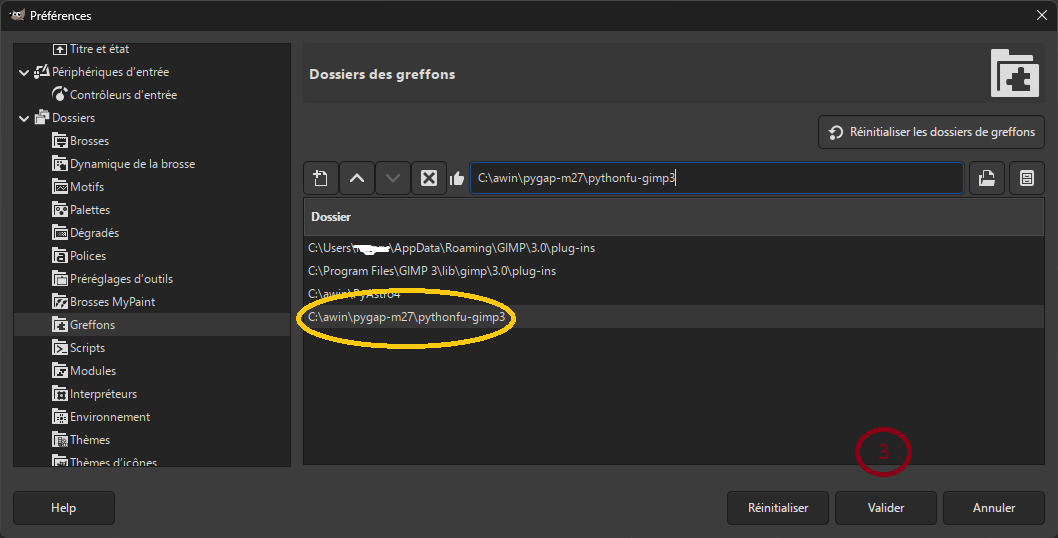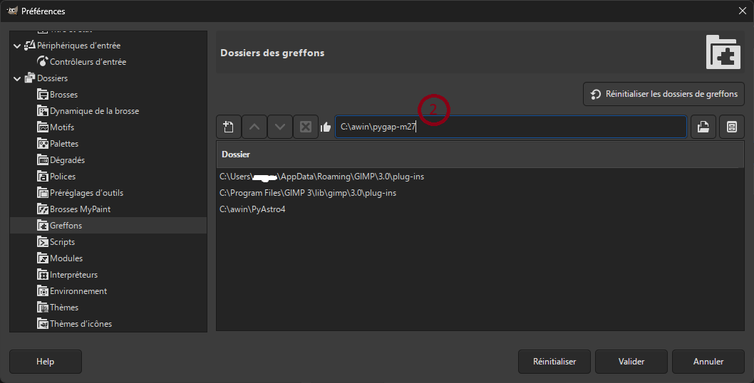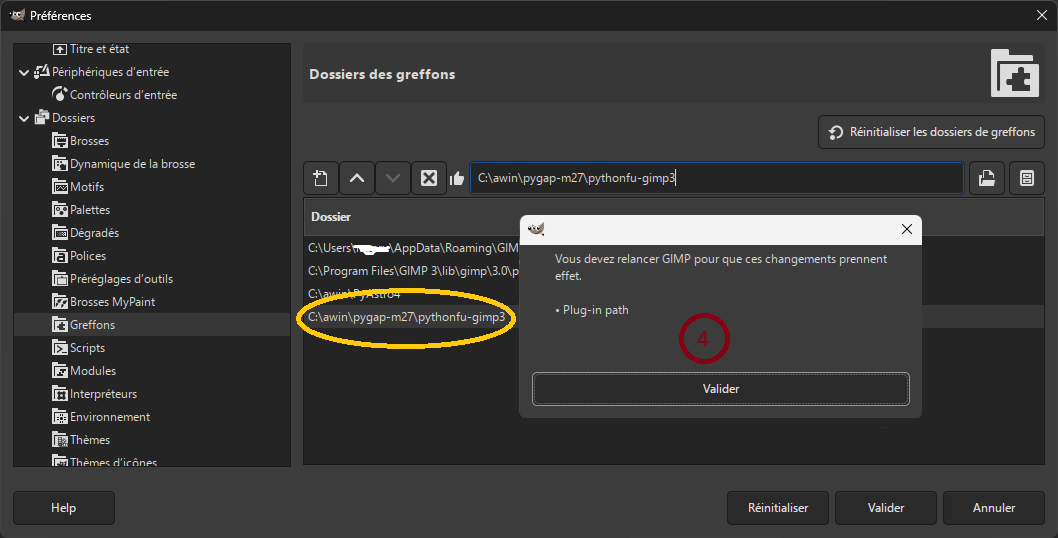En 4 étapes : Cliques sur le bouton '+' Tapes dans le champ de saisie le chemin du dossier '..<path>..\pygap-m27\pythonfu-gimp3' puis [return] La ligne saisie doit apparaitre en dessous (jaune) , puis cliquer sur le bouton 'Valider' Un popup apparait demandant de redémarrer GIMP. Valides le popup et redémarres GIMP. si tu veux installer la V4 de Py_astro pour GIMP3 : c'est identique à la procédure de pyGapM27. C'est-à-dire tu dézippes l'archive et puis tu ajoutes le dossier PyAstro4 dans les greffons et tu redémarres GIMP.