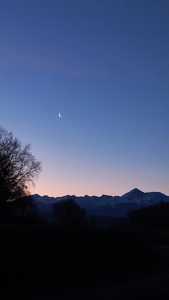3. Bonjour à tous, Avec un ciel clair ce matin, je vous propose un petit paysage avec un croissant lunaire au dessus des Pyrénées enneigées Au smartphone