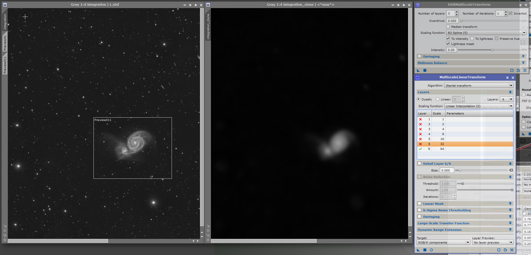 Ce n'est pas le process le plus compliqué à utiliser et il ne faut pas l'utiliser en linéaire. Pour se simplifier la tâche, une étape importante à mon sens, c'est d'employer un masque. Pour ça je duplique l'image, je vire un certain nombre de couche avec MLT et je décale le point bas de l'histogramme pour assombrir le fond de ciel. L'idée c'est d'appliquer le process uniquement sur les objets lumineux. L'ajout récent du slider intensity est bien venu pour affiner, ça manquait cruellement. Petit exemple d'un traitement en cours : -