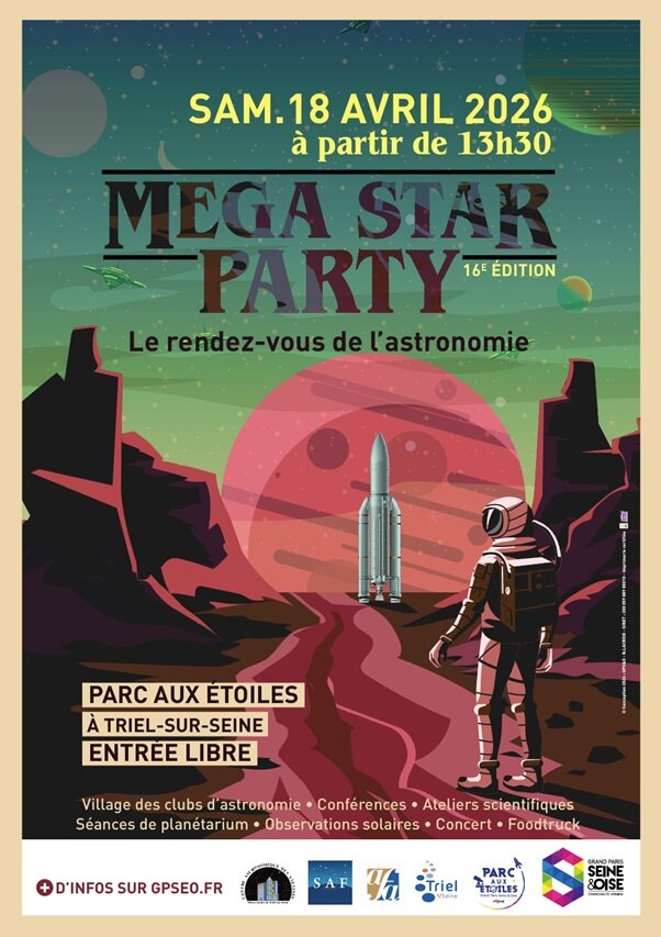 Amis astronomes Le Parc Aux Etoiles et le Centre Astronomique des Yvelines coorganisent, à Triel-sur-Seine, la 16ème Méga Star Party. Autrement appelé Le rendez-vous de l'astronomie, il se déroulera le samedi 18 avril 2026. L'adresse : 2 rue de la chapelle 78510 Triel-sur-Seine Les coordonnées GPS : 48.9983, 2.0094 Au programme (en bref) : Village des clubs d’astronomie Conférences Ateliers scientifiques Séances de planétarium Observations solaires Concert Foodtruck Au programme (en détail) : CONFÉRENCES (Attention nombre de places limité, réservation conseillée) : 13h45 : La vie dans l’Univers par Caroline Freissinet, Chargée de recherche CNRS – LATMOS laboratoire atmosphères, Université Paris – Saclay. Tout public dès 8 ans 15h30 : Retour sur le paradoxe d’Olbers, sera donnée par Thierry Midavaine – Astronome Amateur, Président de la Commission des Techniques en Astronomie Amateurs à la SAF et responsable du partenariat SAF SF2A pour les collaborations ProAm Gemini. Tout public dès 15 ans PLANÉTARIUM (Nombre de place limité, inscription sur place) : Venez découvrir la diversité des systèmes stellaires de notre Galaxie à travers un voyage entre les étoiles lors d'une séance de planétarium ! Séances toutes les 45 minutes à partir de 13h30 ATELIERS SCIENTIFIQUES et ANIMATIONS (En accès libre et en continu à partir de 13h30) : Village des associations d’astronomie des Yvelines et du Val-d’Oise : Présentation d’instruments, activités du club. Observations solaires (si les conditions météorologiques le permettent). Animations scientifiques en continu menées par l’Association française d’astronomie Les médiateurs du Parc aux étoiles proposeront en continu des ateliers ludiques à destination des familles : Fusée en papier (à partir de 6 ans) Dessine-moi une planète (à partir de 4 ans) CONCERT : De 17h à 18h30 : Opium Minded, groupe de musique Pop/ Funk propose des morceaux culte des années 80, hymnes des années 90, tubes des années 2000 Pour encore plus d'informations : https://parcauxetoiles.gpseo.fr/actualites/mega-star-party-16-eme-edition Venez nombreux et à bientôt Le CAY