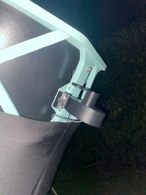 J'ai trouvé une pièce de récup dans mon four tout qui serait intéressante pour faire la jonction tube pvc - crémaillère En plus comme c'est une pièce qui ai faite pour poser un miroir, il y a les 3 visses de collimation qui pourront servir pour régler l'alignement de la crémaillère. Je la fixe sur le tube, je fixe la crémaillère dessus. -