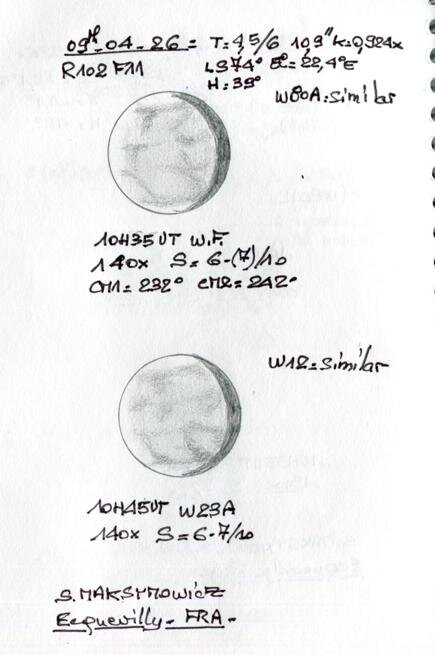 2. Le dernier coup de rein pour collecter sur vénus aujourd'hui sous un ciel laiteux. La météo ne permet même pas pour observer 4 jours consécutifs ici. Le planisphère attendra. A suivre. Le set de dessins réalisé ce 9 avril.