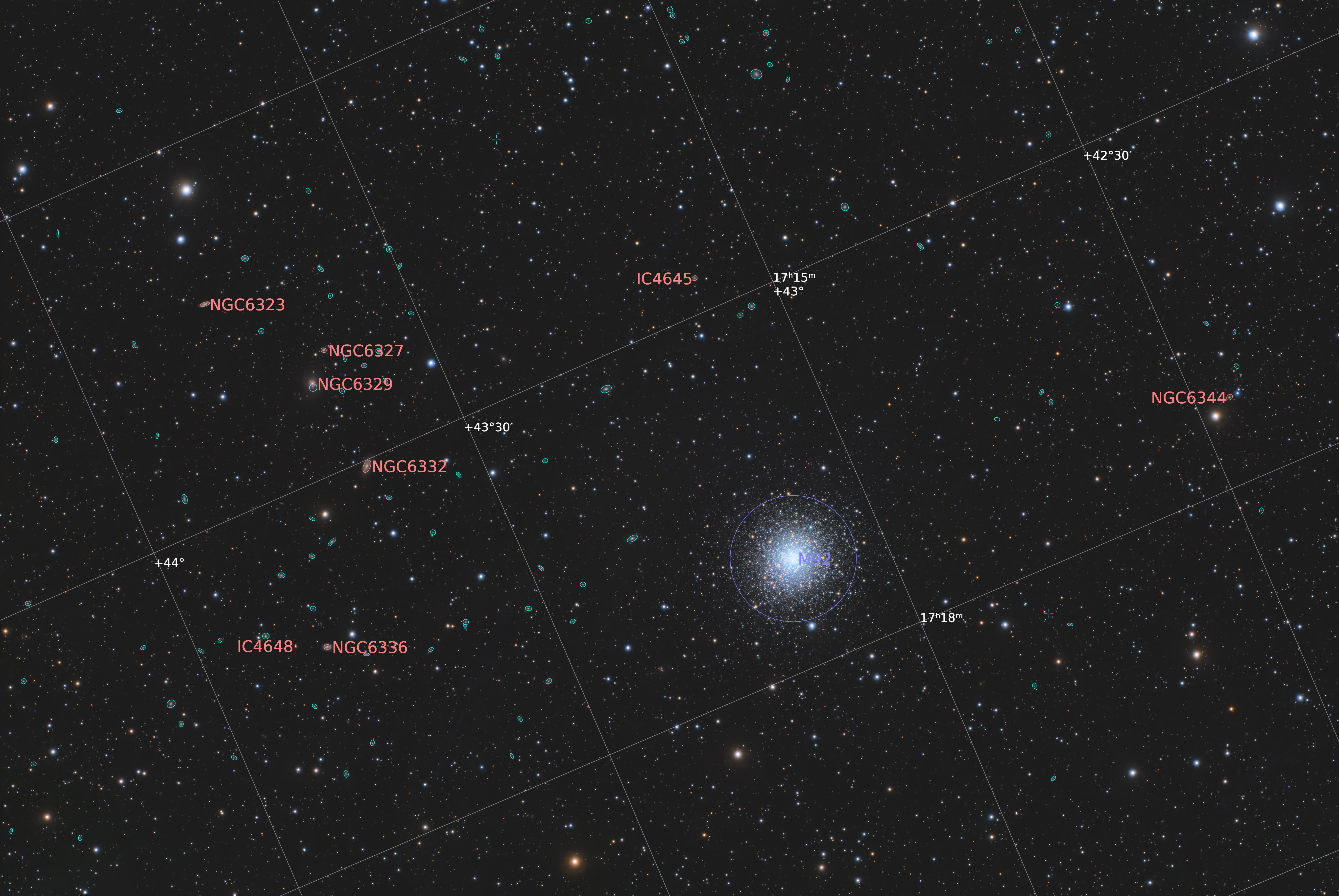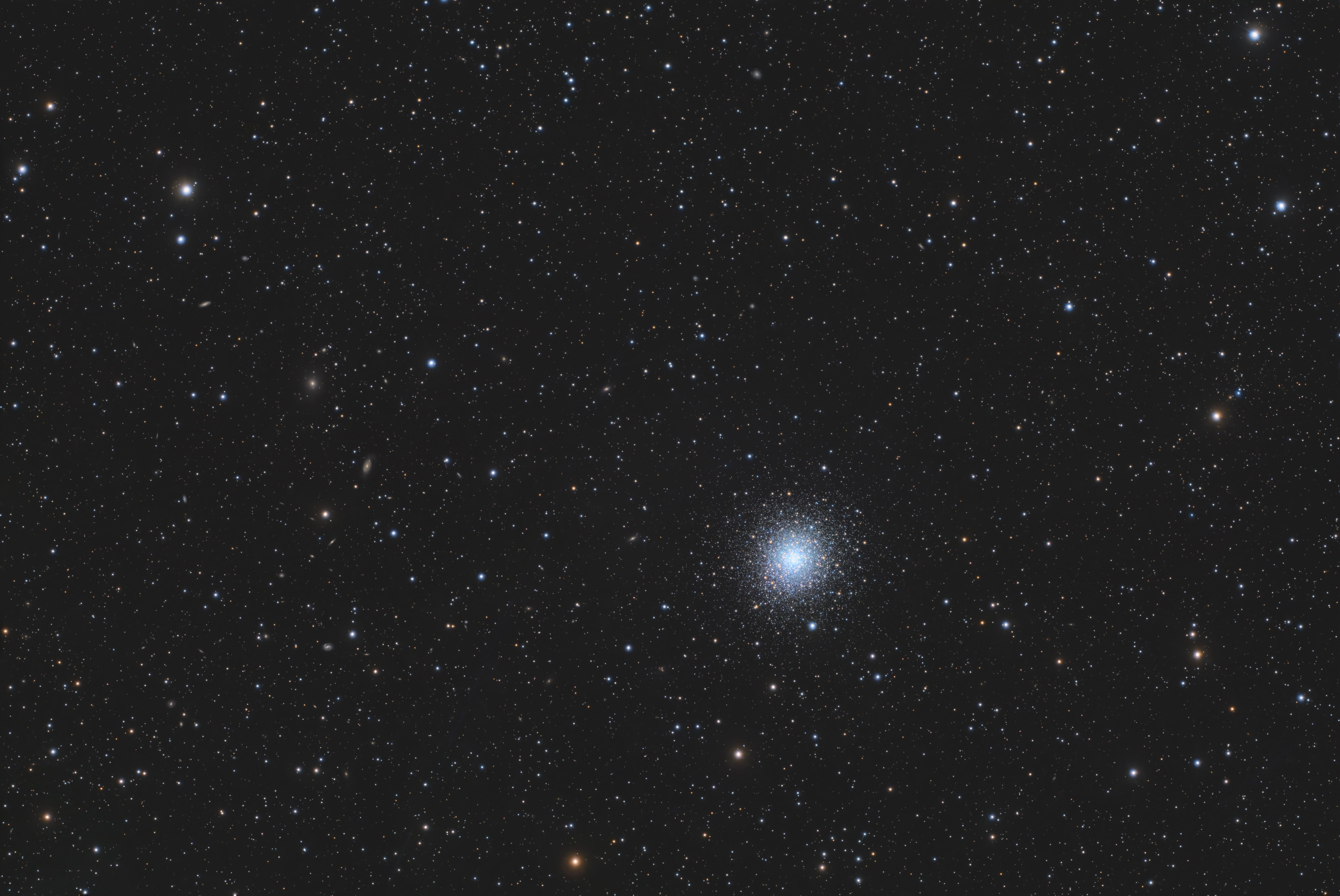 Hello, j'ai eu pas mal de petites misères en astro ces derniers temps et j'ai perdu du temps de ciel disponible. A cause de l'USB, pour des problèmes d'astrométrie, bref... Hier soir j'allais me coucher, flemme, et une fois au lit j'ai eu des remords et je me suis relevé, vers 1h30. Petite cible relativement simple mais que je n'ai jamais imagé, et j'ai bien faire un amas globulaire de temps en temps, ça reste très esthétique. Il aurait fallut faire des poses plus courtes pour ne pas cramer le cœur mais là encore, pas trop le courage, donc poses de 5mn. J'ai réussi malgré tout à réduire la casse en faisant une superluminance avec les couches RGB. J'ai toujours des difficulté à réduire les halos, mais sans investissement je suis condamné à les subir. La zone est sympa, outre l'amas il y a une grande quantité de petites galaxies dans le champs. Altair 183M mono non refroidie + Skywatcher 72ED sur HEQ5, NINA, PHD2, Pixinsight L : 12x5mn soit 1h R : 9x5mn soit 45mn G : 9x5mn soit 45mn B : 9x5mn soit 45mn Total : 3h15 Le lien Astrobin : https://app.astrobin.com/i/oldkoq La version annotée, avec le nom des plus grandes galaxies :