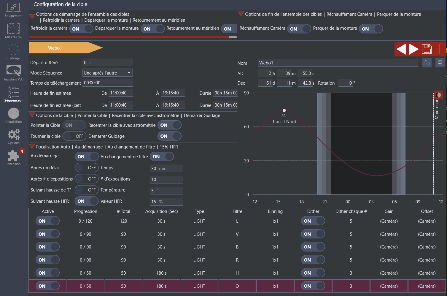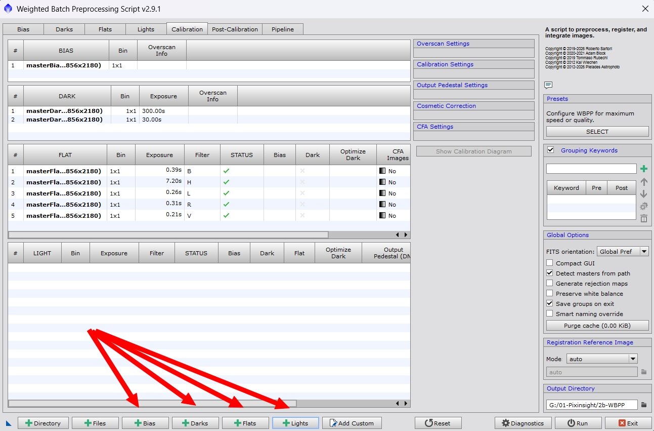 Excellent choix Dans NINA et avec le séquenceur simple, je fais des séquences comme ci-dessous avec refocus à chaque filtre en plus de la dérive de HFR. Pour les flats, rien de plus compliqué que ce que tu fais certainement déjà, sauf qu'il faut en faire pour chaque filtre. Ca peut se faire tranquillement après ta séance de captures. Pour le prétraitement, WBPP pourrait bien être ton ami. Tu lui indiques où sont les images Lights/Flats/Darks/Bias et clic sur Run. Sur ma copie d'écran on voit les masters qui ont été générés sur un prétraitement précédent. Ils peuvent être réutilisés si les paramètres d'acquisition sont les mêmes et si tu n'a s rien modifié dans la chaine optique pour ce qui est des flats. Si tu as des temps de pose différents (par exemple comme pour moi, 30" et 300"), tu indiques l'emplacement de tous ces fichiers à l'étape précédente, Pix fera le tri. Quelque temps plus tard, durée variable selon le nombre d'images, leur taille et les perfs de ton ordi, tu trouveras tous les stacks alignés dans le dossier "master" de l'output directory que tu auras indiqué (en bas/droit) de WBPP. Si tu as mis toutes tes images dans le même répertoire (lights, flats, darks, bias), tu peux même indiquer le Directory au lieu de faire ça pour chaque type d'images. Si il y a des durées différentes (30" et 300"), Pix s'occupera de faire son tri tout seul. Je te conseille de faire le prétraitement avec des bias pour t'éviter toute prise de chou. L'écart avec des méthodes plus élaborées comme les bias synthétiques ne donne quasiment aucun écart perceptible par l'oeil humain, le mien en tous cas. De toutes façons le traitement qui suivra (BXT, NXT) éliminera définitivement ce micro-pouillème d'écart. On parle ici d'un IMX571, pas d'un capteur de Canon 1000D.. -
