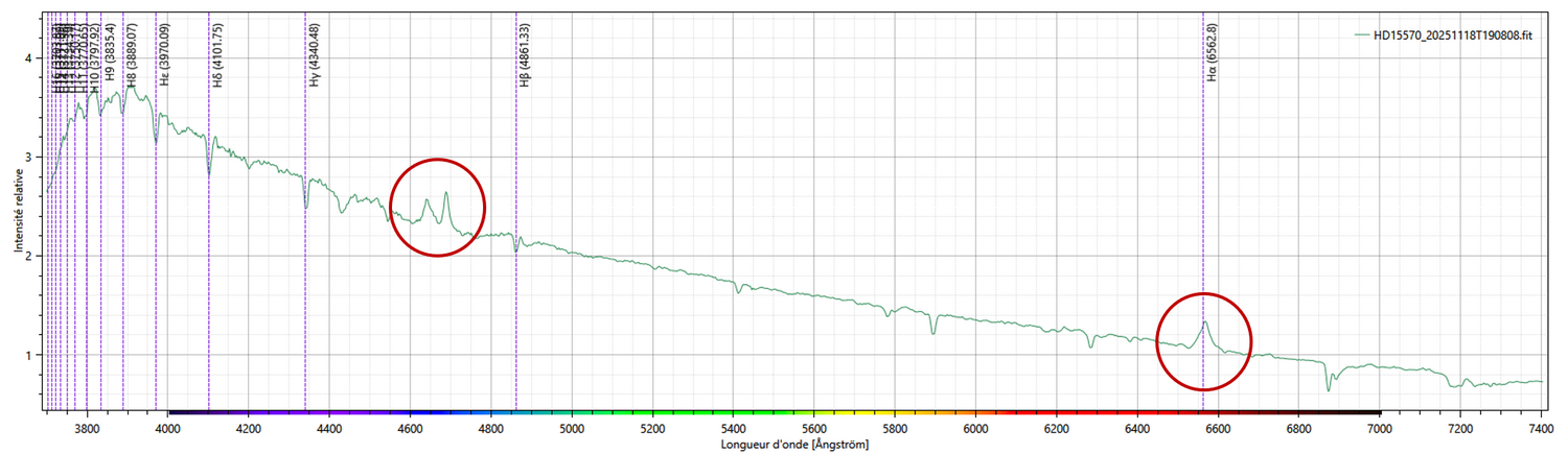 Je m'étais attardé également sur ces deux étoiles apparemment banales mais en spectro. Elles sont remarquables comme tu l'as bien signalé ! HD15570 est de type spectral O4If : O4 - Étoile de type O, sous-classe 4 : parmi les plus chaudes de la séquence O I - Classe de luminosité I : une supergéante, très haute luminosité, atmosphère étendue, faible gravité de surface. f - qualificatif spectral indiquant que le spectre présente une émission dans certaines raies ionisées (N III λ4634-4640–4642 et He II λ4686), signatures fortes de vent stellaire. Certaines publications suggèrent que HD15570 serait une étoile intermédiaire entre une O et une Wolf-Rayet (comme le croissant par exemple). Avec un peu de patience on pourra en faire de belles photos Pour HD15558, les estimations (minimum) de masses pour les composantes sont très élevées. La primaire pourrait avoir une masse de ~ 150 ± 50 M☉, la secondaire ~ 50 ± 15 M☉.. Ce serait même un système triple ce qui permettrait de “répartir” la masse entre plusieurs composantes. Et je trouve ton image de Melotte 15 particulièrement réussie avec ses détails et les nuances de bleus et de verts. Un petit coin de ciel pas banal du tout !