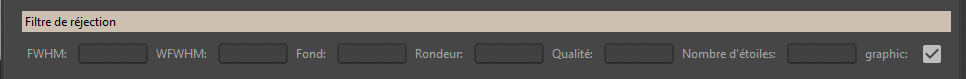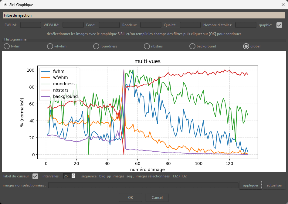 La doc sur Siril.org n'est plus à jour depuis la sortie récente de Sirilic 2.0 : il faut plutôt consulter le wiki sirilic La première nouveauté de Sirilic 2.0 : c'est l'intégration comme plug'in dans SIRIL. La seconde nouveauté apporte un petit plus : c'est la possibilité de sélectionner interactivement les mauvaises images avant l'empilement ou/et régler finement la valeurs des filtres en cochant graphic : exemple de courbe pour trouver la valeur optimale de FWHM : FWHM, WFWHM, ROUNDNESS, NBSTARS et BACKGROUND sur le même graphe: Dés-sélection des images de 48 à 52 et de l'image N° 57