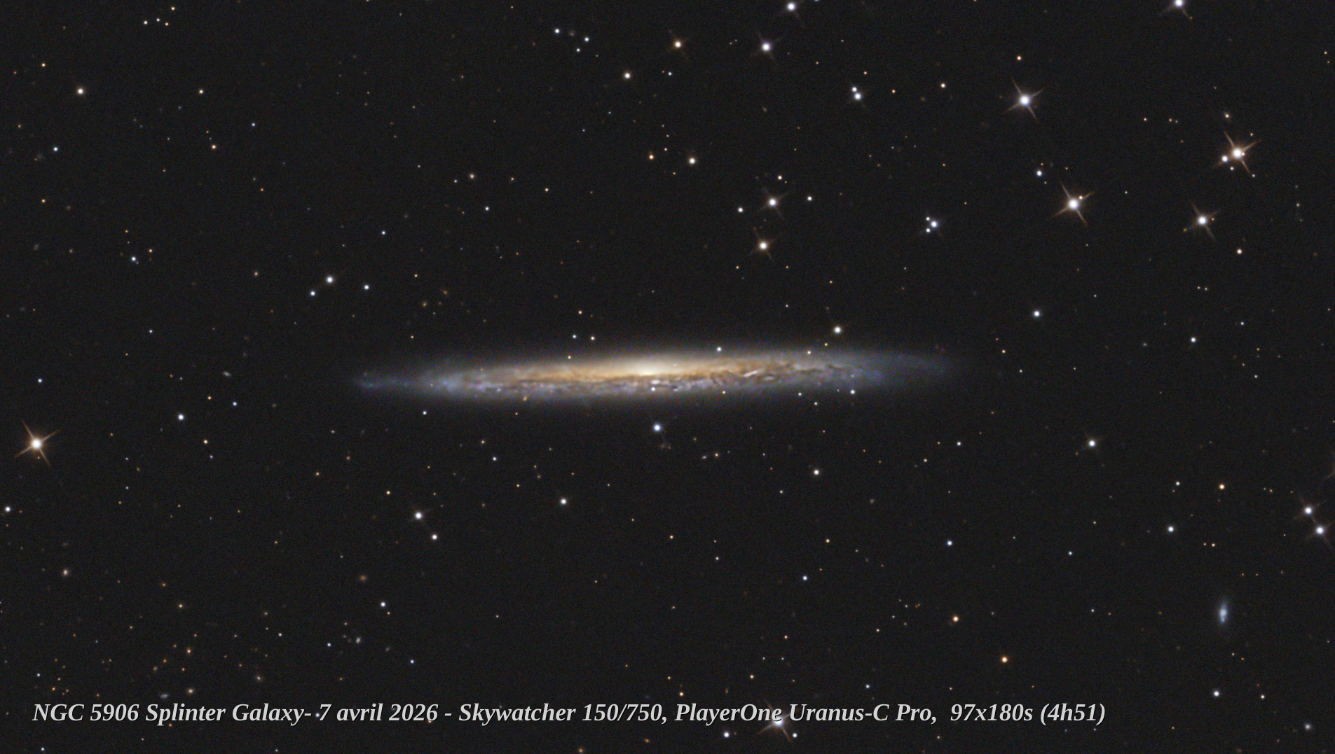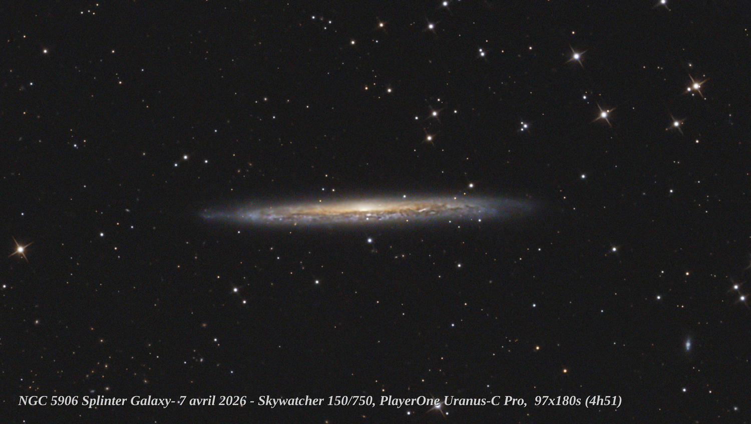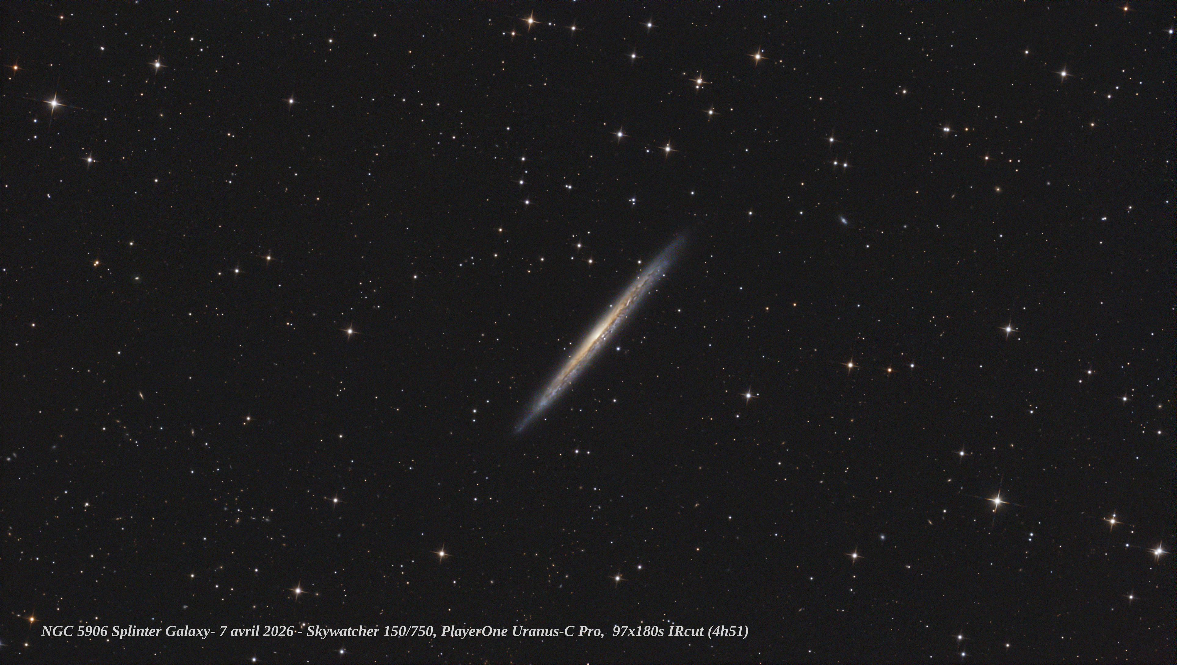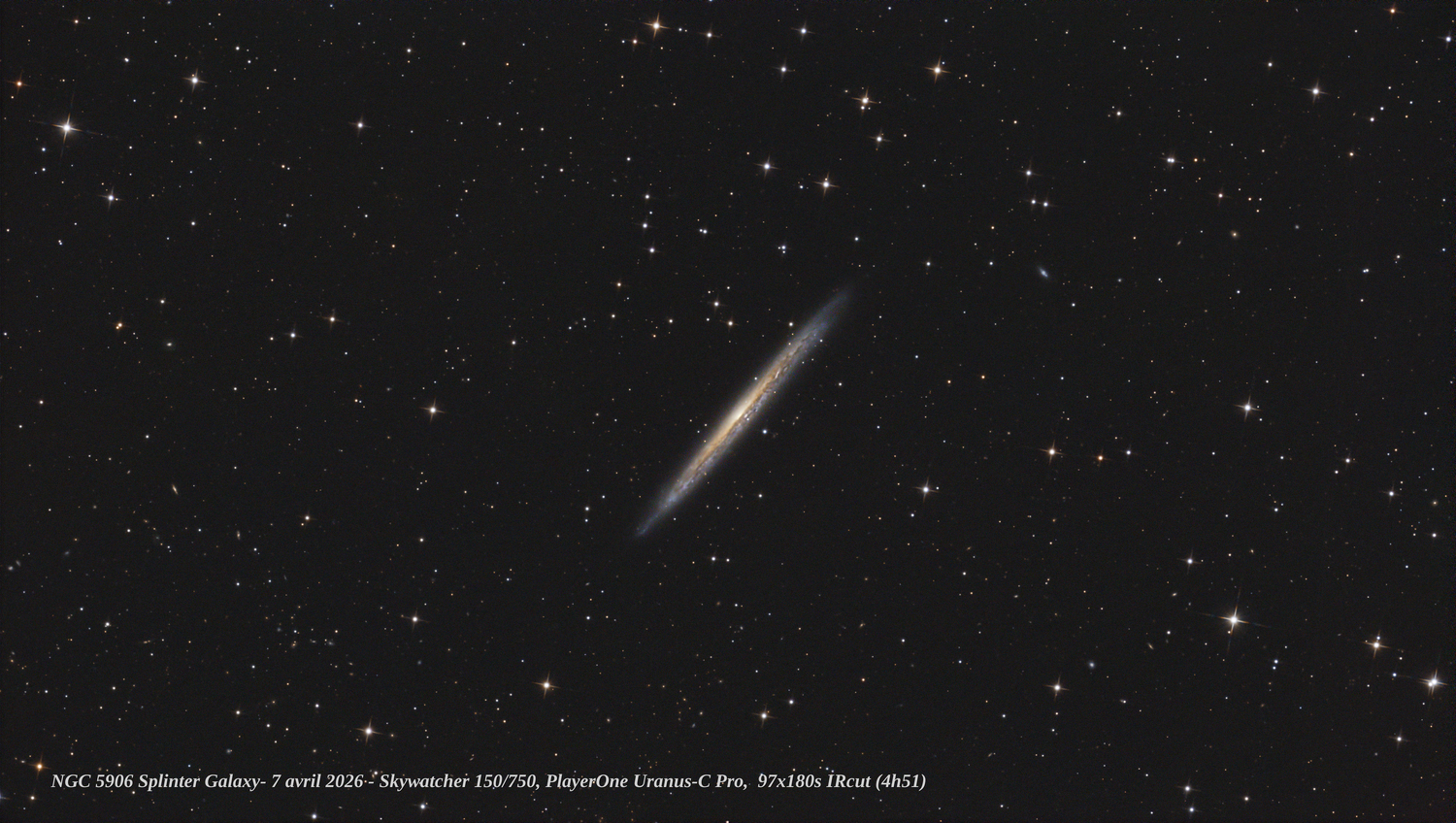 Hello, Un coup de chance la nuit dernière, ciel clair et zero vent. Et hop un 'tit coup de Newton et un rare guidage sans encombres NGC5906 aka Splinter Galaxy, 97x180s en IRcut et traitement Pix simple. Il était prévu plus de temps mais la capture s'est arrêtée après le flip (c'est reparti pour fouiller les logs...) Bon ciel! Philippe Le crop: La full