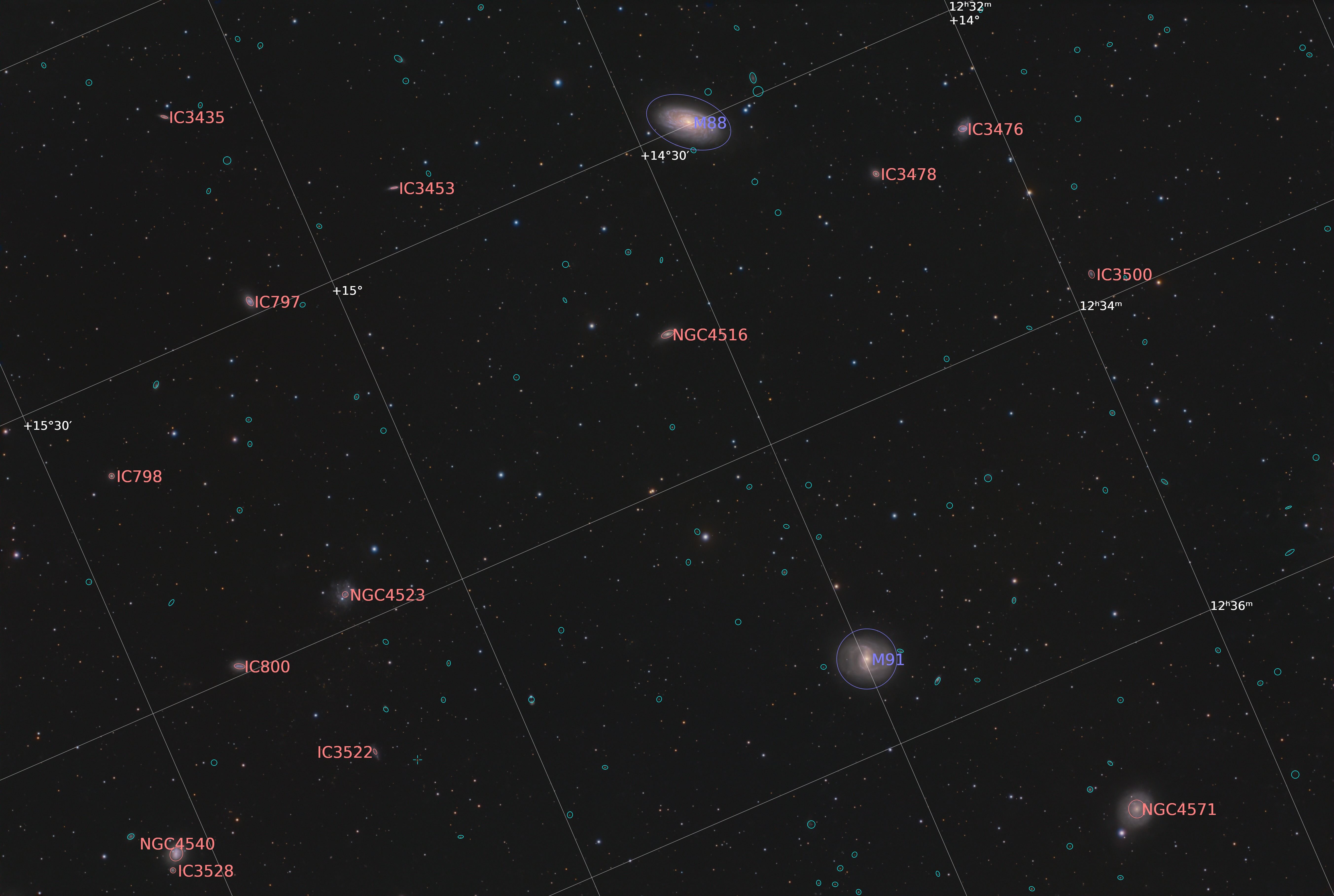 Hello, cette période de l'année n'est pas ma préférée car les nuits raccourcissent à grande vitesse et le ciel offre surtout des galaxies de taille modeste alors que je ne suis pas franchement équipé pour. Néanmoins le ciel est suffisamment vaste pour permettre de trouver des cibles intéressantes, et inédites dans mon cas. Même si ce sont des Messier. Ce couple galactique est intéressant car les deux vedettes principales sont assez différentes. Une spirale pour M88, très lumineuse et régulière, et une spirale barrée moins lumineuse et plus torturée pour M91. Il y a également un paquet de galaxie environnantes de tailles raisonnables et aux formes diverses et variées. Certaines comme NGC4523 semble avoir eu un passé compliqué. Elle doit être une bonne candidate à imager avec de la focale. Le temps de pose total est modeste mais permet de mettre en valeur l'essentiel. Rien de particulier non plus au traitement, toujours entièrement sous Pixinsight. Altair 183M mono non refroidie + Skywatcher 72ED sur HEQ5, NINA, PHD2, Pixinsight L : 12x5mn soit 1h0 R : 9x5mn soit 0h45 G : 9x5mn soit 0h45 B : 8x5mn soit 0h40 Total : 3h10 Le lien Astrobin : https://app.astrobin.com/i/bfzjd0 La version annotée avec les plus grosse galaxies :