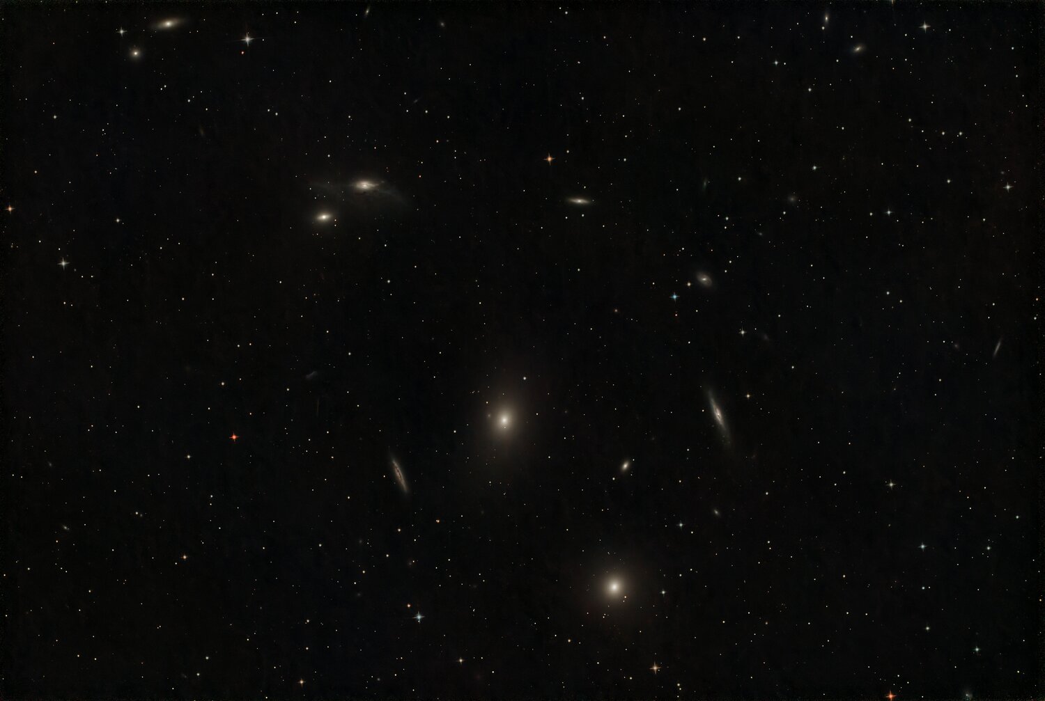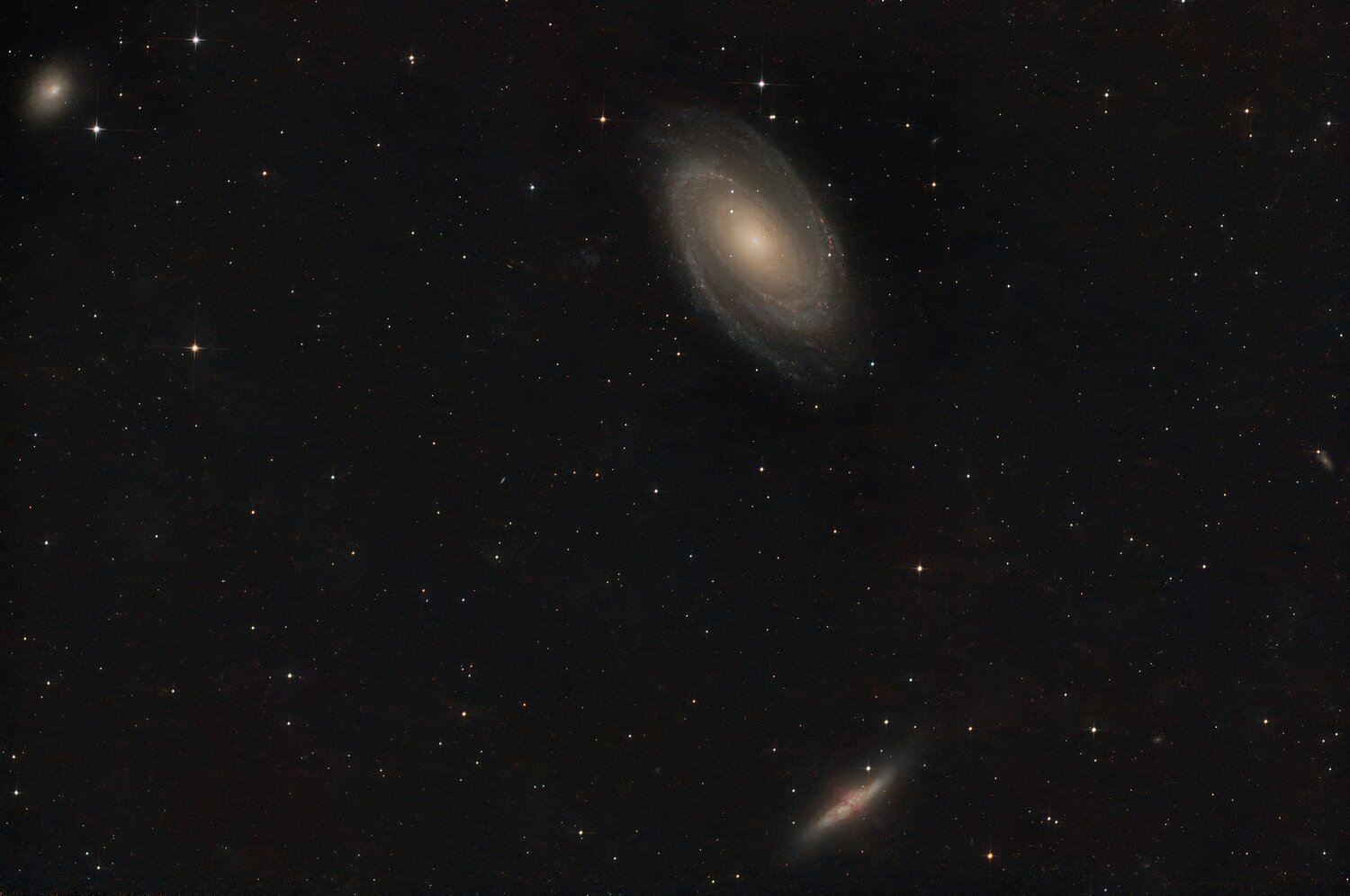 J'ai profité des quelques jours de beau temps pour faire quelques images de champs de galaxies dans le lion ou la grande ourse. entre le 19 et le 23 mars i) Matériel Newton SW 200/1000 avec correcteur de coma, filtre IDAS NGS1, camera ASI 2600 MC refroidie à -10°C. autoguidage avec lunette 80/400 et asi 120 mini. logiciels Cartes du ciel, APT, phd2 . Ciel Bortle 7 pas de lune ii) Poses de 30''. 170 retenues pour M81M82 (85 min) 180 pour La chaine de Markarian (90 min) et 260 pour M95M96M108 (130 min). Dithering toutes les 8 poses, Flat, dark. iii) Traitement Flat, dark, dithering, GraXpert, Siril, Starnet . Un peu de traitement pour réduire les défauts chromatiques sur les étoiles (bleu d'un coté, rouge de l'autre) qui apparaissent à la montée d'histogramme. Traitement à part de M81 et M82 pour conserver les détails de la structure de M82. Je ne suis pas mécontent de la résolution obtenue sur M81 en particulier (les bandes de poussières ou les nébuleuses en Halpha) . et aussi un peu subjugué par la beauté de la chaîne de Markarian et les quantités de galaxies qu'on peut déceler sur l'image. La durée de pose totale est courte sur chaque image alors le fond de ciel n'est pas loin des extensions des galaxies. En le réduisant je perds aussi un peu sur les aigrettes des étoiles. Le traitement du bruit par graXpert est remarquable comparé à ce que propose Siril mais peut-être un peu poussé sur mes images (sur les spirales de la chaîne de Markarian ou sur les extensions de M95 et M96 notamment). Je suis preneur de vos commentaires :-) -