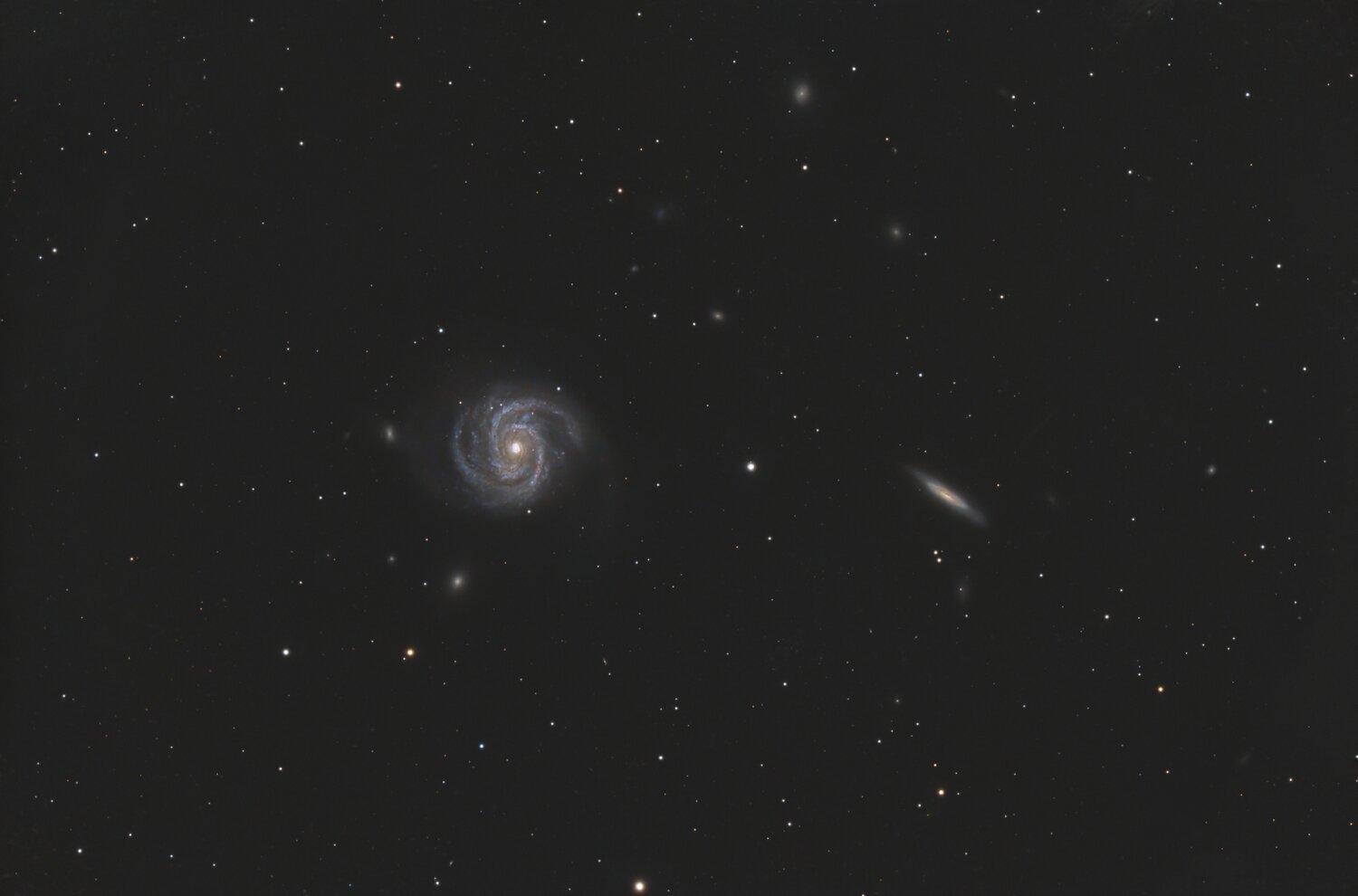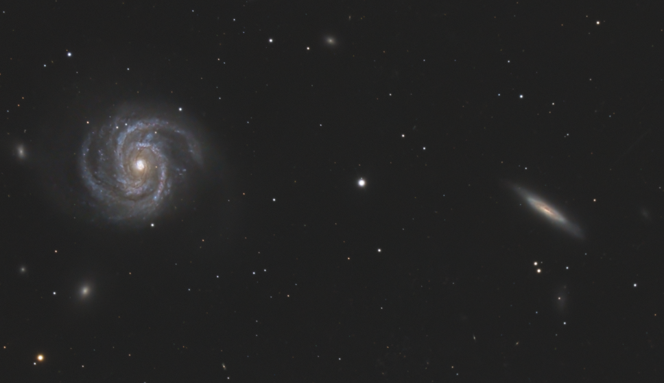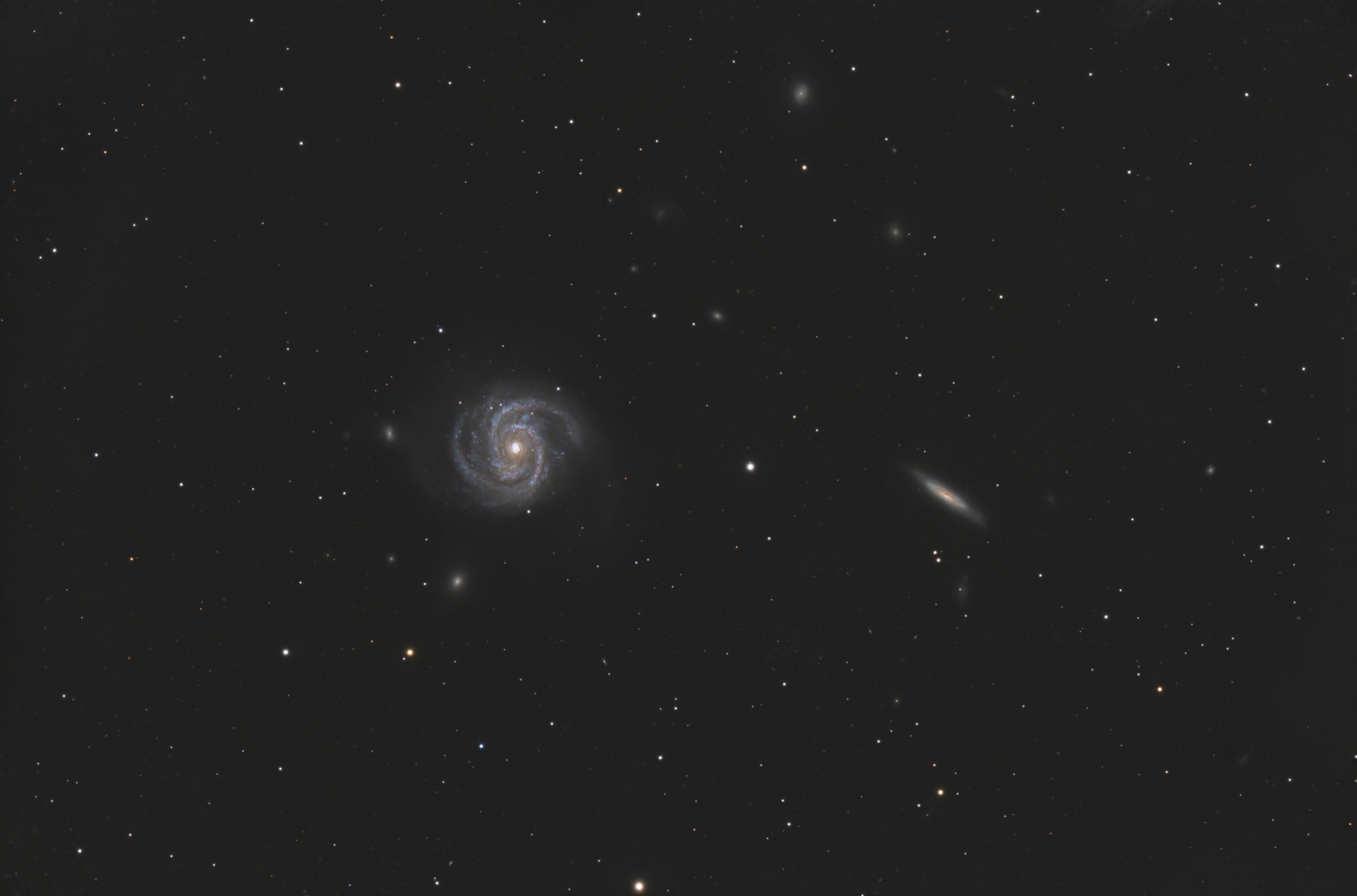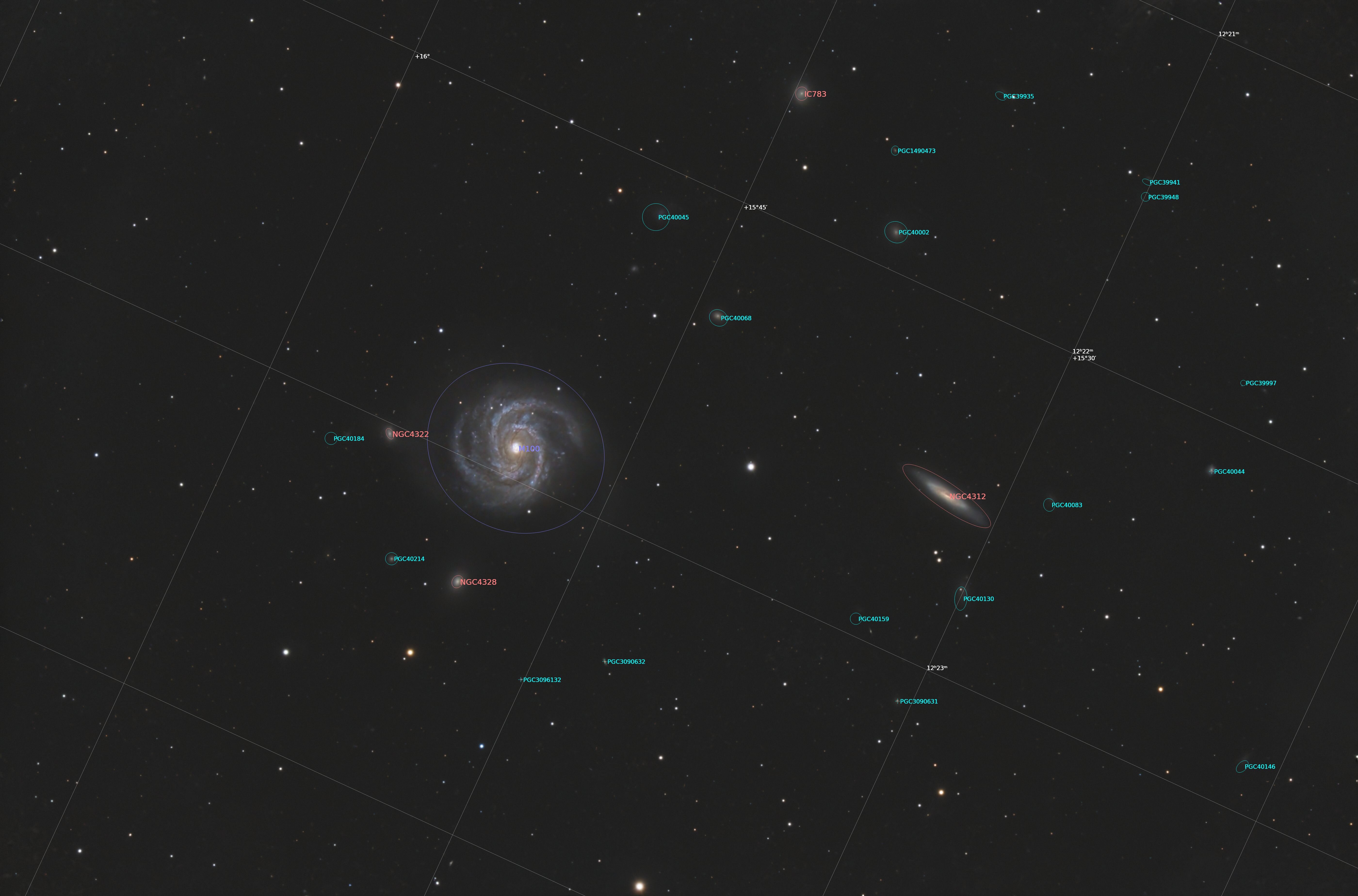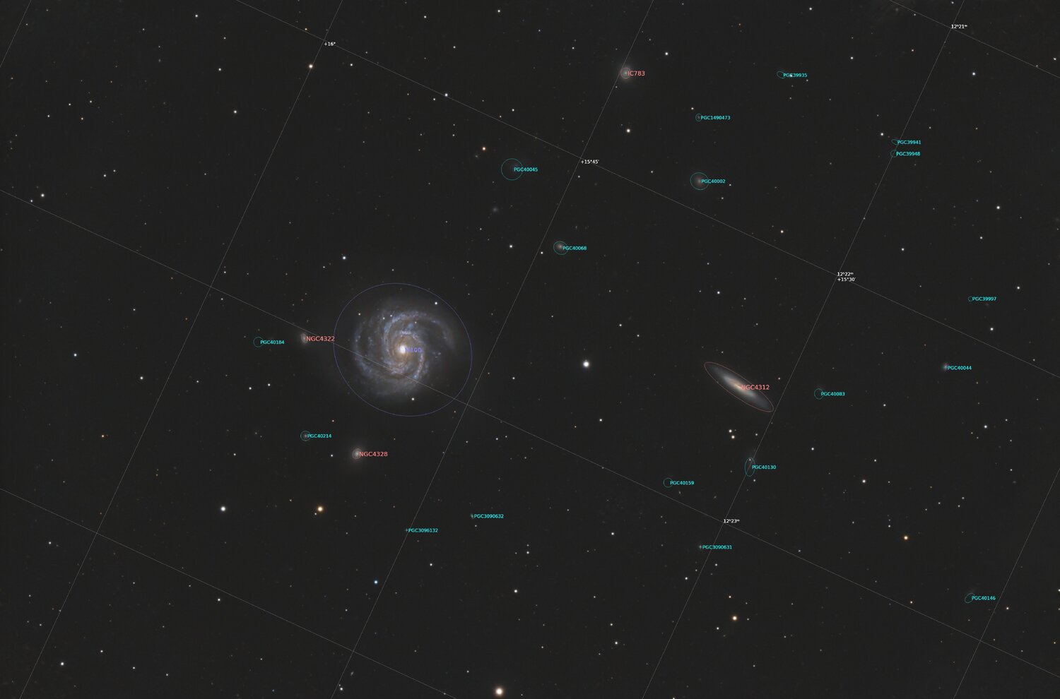 Hello, comme pour M109, j'ai décidé de repasser par M100 que j'aime bien aussi. J'ai pu récupérer 3h30 de la nuit passée avec arrivée des nuages vers 3h. Mais comme j'avais prévu le coup j'avais recentré ma séquence comme en 2025 et j'ai donc pu cumuler les 2 années pour un total d'environ 9h sans filtre en ville. Poses de 45s en 2025 et 60s en 2026 C8 à F/6.3, Altair 26C toujours sur AZEQ6. Je crois qu'il faut que je vérifie ma collimation car mes étoiles au centre sont un peu allongées sur les brutes... Je suis un peu étonné car en poste fixe mais bon, je verrai bien. J'ai poussé un peu plus les couleurs que d'habitude (en général je n'ose pas trop car jetrouve que ça fait monter du bruit dans les couleurs que je n'aime pas trop) a+ Sam Voici la version intégrale, un crop et l'annotée
