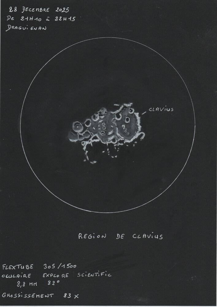 Bonjour à tous, pour mon 3 eme dessin lunaire, j'ai tenté Clavius. Quelques turbulences mais dans l'ensemble ça s'est bien passé. Je n'ai pas votre niveau mais je suis satisfait du résultat. J'ai utilisé le flextube 300. et oculaire 8,7 mm 82° E.S J'ai fait une erreur en inscrivant le grossissement. Il est de 170 x et non 83x, c'est l'habitude de me servir du 18mm pour le ciel profond. Je vous souhaite à tous et toutes de bonnes fin d'année.