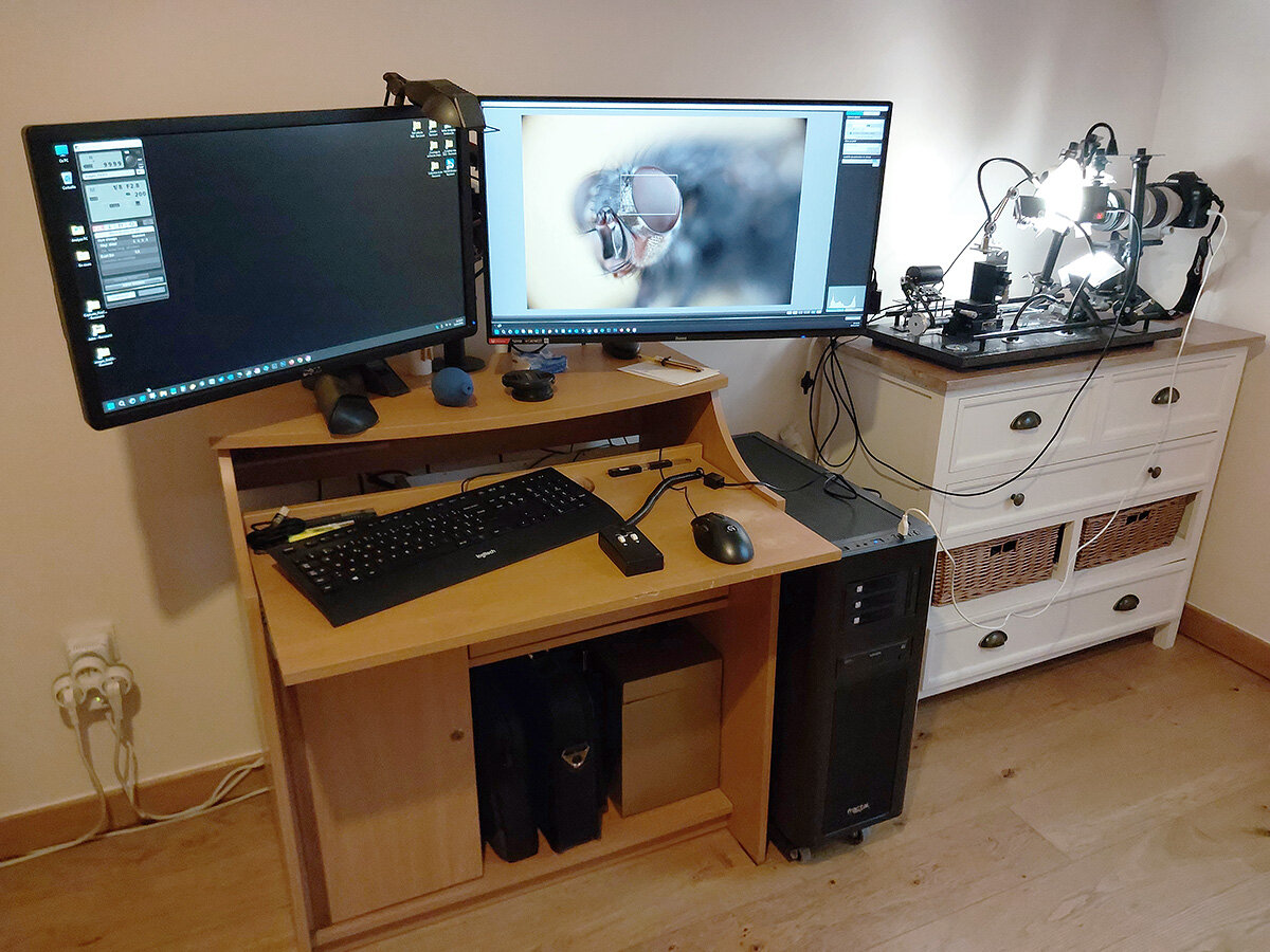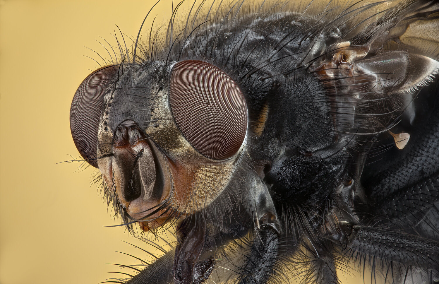 Bonjour les ami(e)s de wa, Tout d'abord, j'espère que tu vas mieux cher Charles. Je vous partage une grosse mouche dite domestique, prise au banc macro avec l'objectif Mitutoyo 5x, l'objectif de tube Canon 70 200 L f2,8 et le Canon 5D MK2. Pas facile à faire ces grosses mouches avec plein de poils noirs bien épais, ça génère du fait de la complexité accrue pas mal d'artéfacts dus à la technique du focus stacking et en plus je l'ai prise de trois quarts, donc avec plus de profondeur de champ à gérer, mais bon, comme dans toute technologie, il faut apprendre et s'améliorer. Image stackée à partir de 213 photos dans Hélicon focus avec la méthode C et lissage à 1. Demain, je pense que demain je lui ferai le "portrait" de face. Amitiés, FRanck