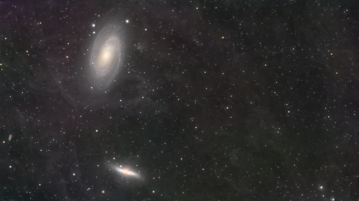 Image du célèbre duo galactique M81 / M82 dans la constellation de la Grande Ourse prise le 10/03/06 depuis mon jardin en Charente. On retrouve à gauche M81 (galaxie de Bode), une spirale relativement calme vue de face, caractérisée par son bulbe lumineux et ses bras bien structurés. À droite, M82 (galaxie du Cigare), beaucoup plus tourmentée, montre une intense activité de formation stellaire, visible par ses zones rouges d’hydrogène ionisé et ses éjections de matière perpendiculaires au disque. Le champ est particulièrement riche en étoiles de premier plan ainsi qu’en petites galaxies d’arrière-plan, ce qui apporte une belle profondeur à l’image. On distingue également quelques régions HII dans les bras de M81, signe d’une formation stellaire plus discrète. Cette image fait suite à une reprise complète de la collimation. J’ai utilisé une caméra de collimation Ocal 4 pour reprendre l’alignement, après avoir constaté un porte-oculaire très fortement désaxé. J’ai également tenté de le repositionner mécaniquement pour corriger ce défaut. À noter que je n’ai volontairement pas utilisé de bague d’ajustement du backfocus pour cette session, afin d’évaluer directement le comportement optique après correction. Il reste encore des défauts visibles, mais le résultat est nettement meilleur que ce que j’obtenais auparavant avec une collimation au laser et au Cheshire. Exifs : 118 x 120 s à 800 ISO Canon 60D défiltré LPF-1 Télescope : SW Quattro 250P (250/1000) Monture : SW EQ6-R Pro Autoguidage : lunette 60 mm + ZWO Mini DOF : 30 / 30 / 30 Pilotage : ASIAIR Plus 256 Go Prétraitement : Siril Traitement : Lightroom