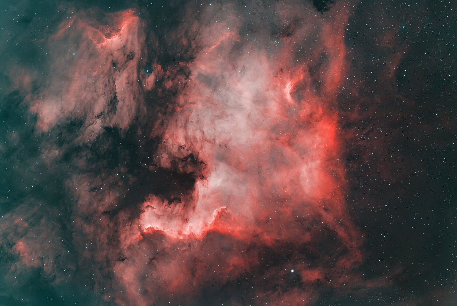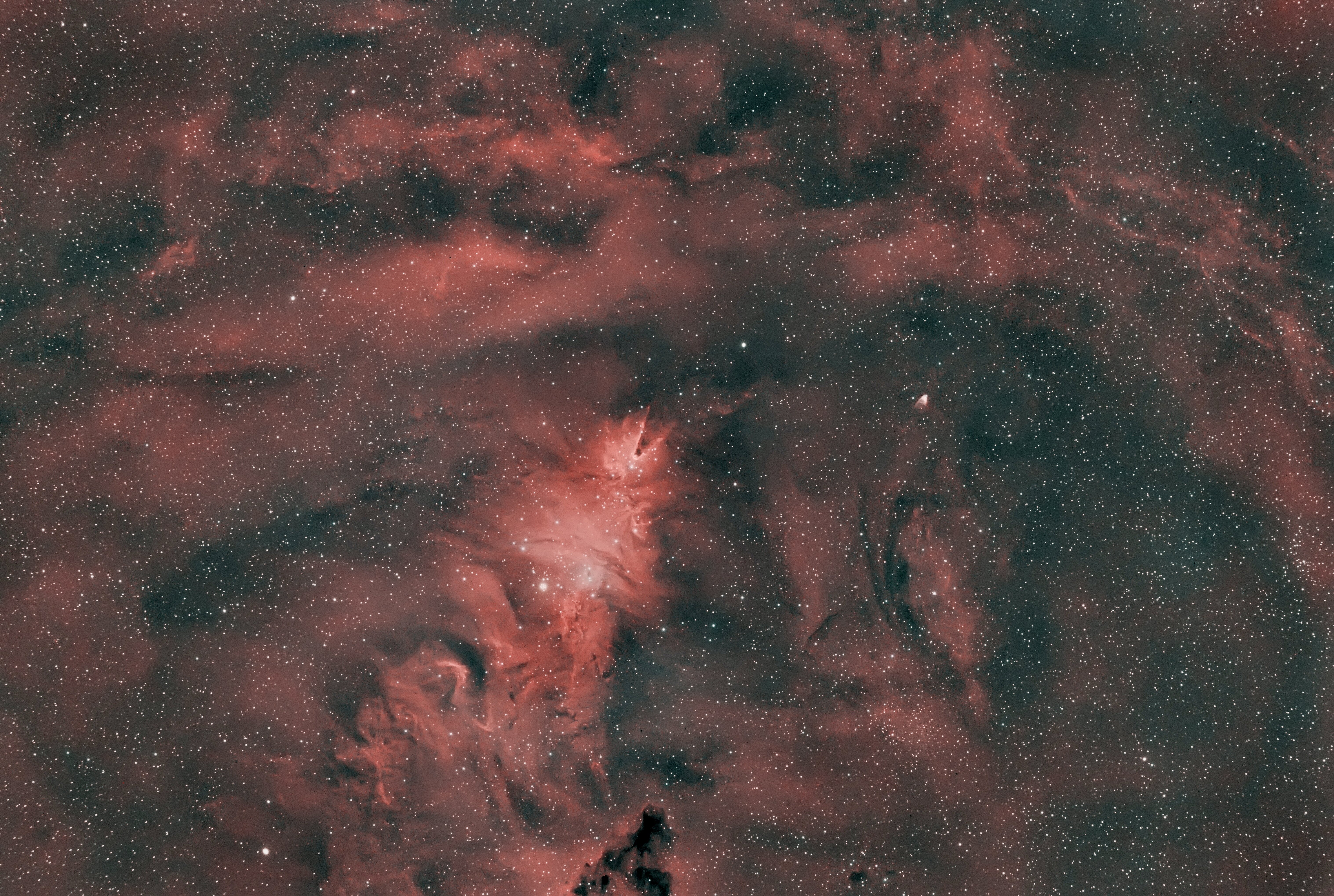 A droite, la grande nébuleuse d’Orion, catalogué M42 et NGC 1976, est une nébuleuse diffuse qui brille en émission et en réflexion au cœur de la constellation d'Orion du bras d'Orion de la Voie lactée, ainsi qu'une importante région à sursauts de formation d'étoiles. Elle est une des nébuleuses les plus spectaculaires, et la nébuleuse la plus intense visible à l'œil nu depuis l'hémisphère nord, de nuit et en l'absence de pollution lumineuse, observable avec des jumelles. A gauche, la nébuleuse du coureur (ou sac à main de sirène), cataloguée NGC 1977, est une nébuleuse par réflexion, excitée et illuminée par l'étoile 42 Orionis. J’ai repris le traitement de cette image, prise en 2014, avec un Canon 350D au foyer d’un Newton 150/750 sur monture Orion Sirius EQ-G (motorisée). 45 poses de 60 s – 15 DOF – ISO 800 – Siril et Toshop.