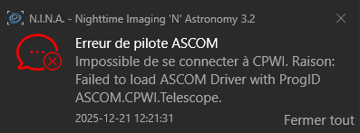 Pour faire un point : Les logiciels que j'ai : Nina (principal), CPWI (contrôle monture), PHD2 (contrôle guidage) et ASCOM (drivers) - APN Canon EOS 2000D : Nina arrive à directement se connecter à mon APN, je n'ai eu besoin de rien faire donc c'est bon pour l'acquisition - Player One Sedna-M : J'arrive à me connecter au guidage grâce à PHD2 et les drivers de PO, mais j'ai une erreur dans l'application liée à la monture - Monture Celestron AVX : J'arrive à prendre le contrôle de la monture avec CPWI sans problème. En revanche, je n'arrive pas à me lier la monture depuis Nina, ni PHD2. Je pense que je dois installer un driver spécifique, que je n'arrive pas à trouver. Voici le message d'erreur de Nina pour la monture : De ce que j'ai compris, je dois aller télécharger un driver moi-même parce que ce n'est plus pris en compte dans ASCOM. J'ai trouvé ceci, je ne sais pas si c'est bon, pour les télescopes Celestron : legacydrivers/TelescopeDrivers at main · ascomghostdrivers/legacydrivers · GitHub Sinon, j'ai souvent vu un logiciel être mentionné, Carte du Ciel. Est-ce que c'est aussi géré avec Nina ou comment ça se passe ? Après je pense que Nina a déjà un gros catalogue en plus de CPWI mais ça pourrait être un plus.