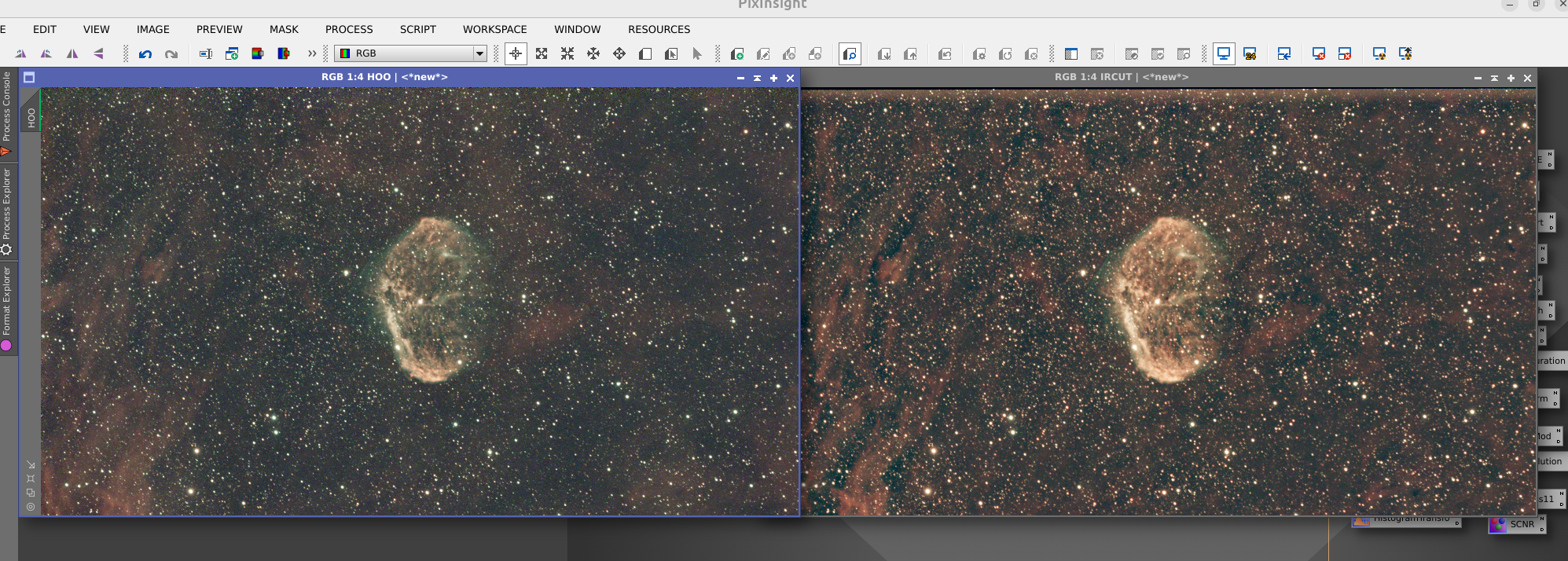 Merci beaucoup pour ces retours! J'ai l'impression que je me fais des nœuds au cerveau ?! @fcouma A force d'essayer de la refaire je commence a être d'accord avec toi! @gadac Je note le noiseX a ajuster au besoin, jusqu'ici je ne faisais que la methode brutus / reglage par defaut et pareil pour noiseX sur starless! @Ant-1 Du coup j'ai carrement repris le stack initial, refait un tri plus aggressif des brutes, et j'en ai profité pour apprendre a utiliser les cartes de rejet (ce que je n'avais jamais fait) dans Siril. Je pense que je gagne en signal, je vérifierai ce weekend. les tendances sont similaires cela dit. Les 2 brutes avec juste un graxpert/background : a gauche le hOO (88 conservées), a droite l'IRcut (108 conservées) A suivre des que j'ai un peu plus de temps! Merci encore -