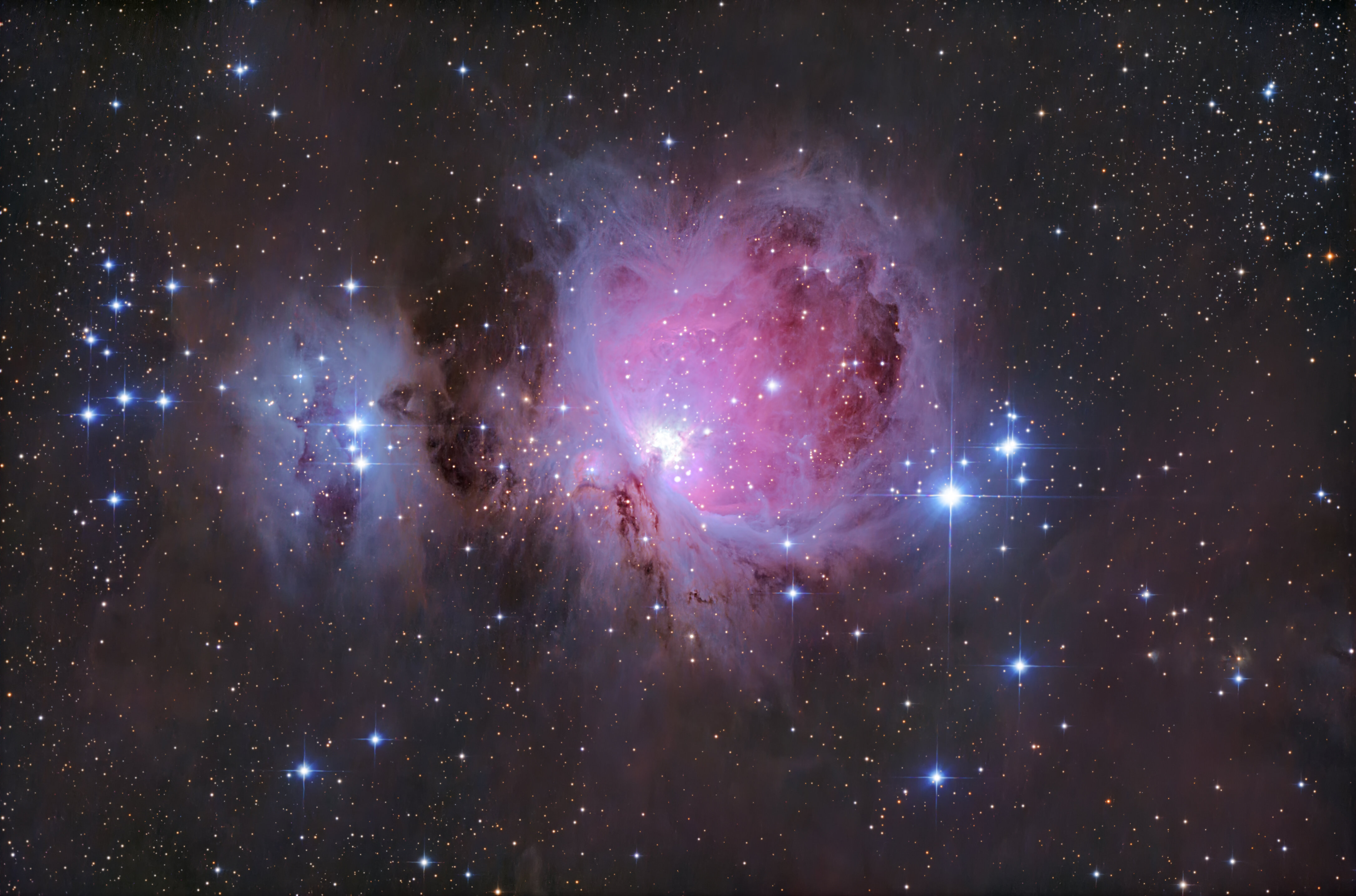 16. Hello, Ce n'est pas encore la saison des galaxies mais du côté de la Girafe, y a de quoi chasser. NGC 1569 est une petite galaxie irrégulière située dans la constellation de la Girafe à environ 10 millions d'années-lumière de la Voie lactée. Elle a été découverte par l'astronome germano-britannique William Herschel en 1788. NGC 1569 a été utilisée par Gérard de Vaucouleurs comme une galaxie de type morphologique IB(s)m dans son atlas des galaxies. La classe de luminosité de NGC 1569 est V-VI et elle présente une large raie HI. C'est aussi une galaxie active de type Seyfert 1 et c'est une galaxie à sursauts de formation d'étoiles. Cette galaxie est une cible de choix pour les astronomes professionnels, car elle est si près de nous que le télescope spatial Hubble peut résoudre individuellement ses étoiles. On peut ainsi réaliser des études poussées sur près d'une cinquantaine d'amas qu'elle renferme. La principale caractéristique de NGC 1569 est son taux de formation d'étoiles extrêmement élevé. Au cours des 100 millions d'années passées, des étoiles y sont nées à rythme 100 fois plus élevé que celui de la Voie lactée. Cette galaxie renferme deux superamas stellaires, le superamas A situé au nord-ouest et le superamas B situé près du centre. Ces deux superamas ont connu des épisodes différents de formation d'étoiles. Le superamas A est en réalité constitué de deux amas rapprochés : NGC 1569 A1 et NGC 1569 A2. Ils contiennent de jeunes étoiles dont des étoiles de type Wolf-Rayet qui se sont formées il y a moins de 5 millions d'années dans NGC 1569 A1. NGC 1569 A2 renferme également de plus vieilles étoiles de type supergéante rouge[14],[8],[16]. Le superamas B contient une population plus âgée de géantes rouges et de supergéantes rouges. Ces deux superamas stellaires auraient des masses comparables à celles des amas globulaires en orbite dans le halo de la Voie lactée, soit approximativement entre 600 000 et 700 000 M⊙. Plusieurs autres amas d'étoiles plus petits ont aussi été aussi observés. La masse de certains d'entre eux est semblable à celle des petits amas globulaires de la Voie lactée ou à celle de R136a dans le Grand Nuage de Magellan. De jeunes étoiles dont l'âge varie entre 2 millions et 1 milliard d'années ont été observées dans ces amas. Plusieurs supernovas dans cette galaxie ainsi que les forts vents stellaires ont donné naissance à des filaments et des bulles d'hydrogène ionisé, dont les tailles respectives atteignent 3,7 et 380 années-lumière. Sur les images captées par les grands télescopes, ces filaments et ces bulles excités par la lumière des jeunes étoiles brillent intensément. On pense que les sursauts de formation d'étoiles de NGC 1569 proviennent de l'interaction gravitationnelle avec les autres galaxies du IC 342/Maffei, mais plus probablement avec un nuage rapproché d'hydrogène neutre. Certains pensent que la galaxie irrégulière naine UGCA 92 est une compagne de NGC 1569, mais la relation de celle-ci avec les sursauts de formation d'étoile n'est pas établie. Des auteurs suggèrent que UGCA 92 n'est pas à l'origine de ces sursauts, alors que d'autres suggèrent qu'elle interagit avec NGC 1569 par une queue de marée gravitationnelle et plusieurs filaments d'hydrogène neutre. Cependant, il se pourrait que ces filaments soient à l'intérieur de la Voie lactée plutôt qu'être associés à UGCA 92. SCT Celestron C8 (203/2000) focale @ 1897mm f/d 9.3 Caméra QHYminicam8 mono Monture HEQ5 kit courroie Rowan Autoguidage via lunette guide 60/270, Asi290mm / PHD2 Acquisition NINA L= 89 x 60s R= 30 x 60s G= 28 x 60s B= 29 x 60s Ha= 31 x 180s OIII= 29 x 180s Mode Full Resolution Gain 82 offset 30 T° -10°C Pré-raitement Sirilic/Siril , Pixinsight. SetiAstroSuite Pro. Une brute de 60s filtre L: