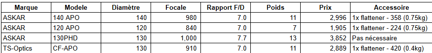 Merci à tous pour vos réponses. J'ai revu mon budget à la hausse et bien à la hausse après avoir réfléchi à la question et je suis plutôt parti sur une lunette APO. J'ai sélectionné 4 lunettes qui me paraissent super intéressantes. Encore une fois, j'ai une monture EQ6-R Pro donc je ne peux pas acheter une lunette de plus de 12-13kg. L'idée est d'avoir un maximum de focale sans que ce soit trop lourd. - ASKAR 140 APO a la plus grande focale et un poids raisonnable mais j'ai lu dans des forums que certaines personnes se plaignaient de chromatisme ce qui me fait hésiter. Je préfére mettre un peu plus d'argent mais avoir quelque chose de qualité. - ASKAR 120 APO niveau poids et budget c'est le top mais la focale est de 840 alors que j'aimerais plutôt me rapprocher des 900-1000. - ASKAR 130PHD j'en ai entendu beaucoup de bien surtout sur sa qualité optique (apparemment meilleure que la gamme APO) mais le poids est élevé et le rapport F/D à 7.7 (en revanche pas besoin de correcteur). - TS-Optics CF APO 130 me paraît être le bon compromis avec une focale à 910 et un rapport F/D de 7, un poids comparable à la 140 APO pour un budget équivalent (surtout si on prend en compte le correcteur). Qu'en pensez-vous @Ant-1 @Olivier-Fantasy @Titophe? -