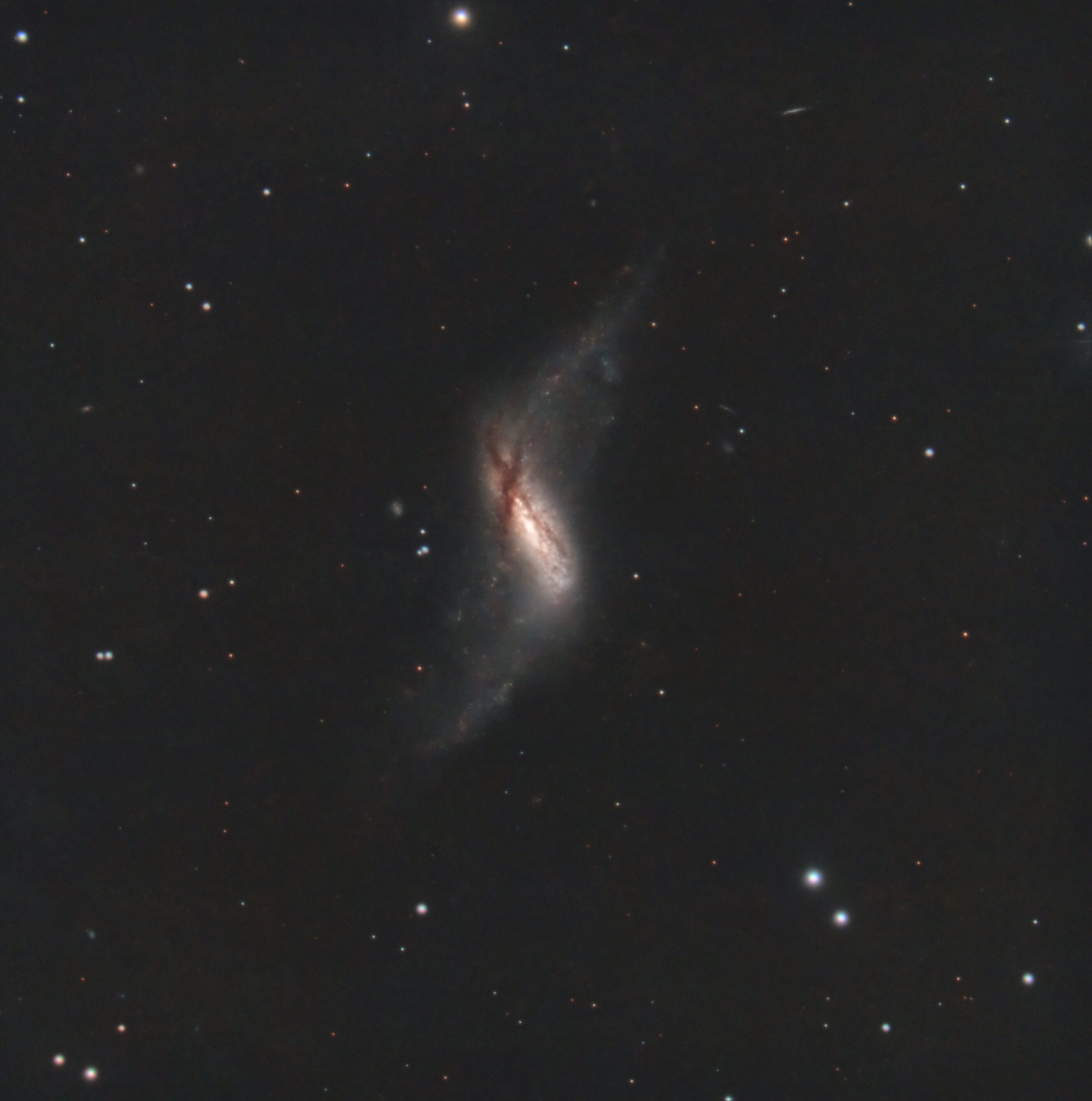 Voici NGC 660, magnifique galaxie dite du type "polar ring". Quelques extraits de https://fr.wikipedia.org/wiki/NGC_660 : NGC 660 est une galaxie active de type Seyfert 2. En raison d'une brillance de surface égale à 14,76 mag/am2, on peut qualifier NGC 660 de galaxie à faible brillance de surface. NGC 660 est une galaxie à anneau polaire, c'est-à-dire qu'un anneau de gaz et d'étoiles tourne autour ses pôles presque perpendiculaire à son plan. On dit de ce genre de galaxie qu'elle est de type PRG, de l'anglais « Polar Ring Galaxy ». Le diamètre de l'anneau polaire de NGC 660 fait plus de 50 000 années-lumière. À ce jour, 16 mesures non basées sur le décalage vers le rouge (redshift) donnent une distance de 13,605 ± 4,526 Mpc (∼44,4 millions d'al), ce qui est tout juste à l'extérieur des valeurs de la distance de Hubble. Vu la proximité de cette galaxie avec le Groupe local, les mesures indépendantes sont probablement plus près de la distance réelle de cette galaxie. Le résultat ci-dessous est une addition de prises de vue avec un seeing pas trop mauvais mais avec une lune bien trop présente, et d'autre sessionshttp://www.astrosurf.com/topic/180151-la-tourment%C3%A9e-ngc-660-au-c11/ une lune moins gênante mais un seeing degueu... Les données: 4 nuits: 07.11.2025 (lune 97%) - 08.11.2025 (lune 92%) - 11.11.2025 (lune 65%) - 13.11.2025 (lune 43%) 225x180" soit 11h15 C11 XLT, f/7.3 avec red. Starizona, F= 2056mm ZWO 533MC pro, Asiair mini, filtre Antlia tri-bandes, OAG avec ASI 220 mini Monture AZEQ6 reliftée 2025 Siril, SetiAstro