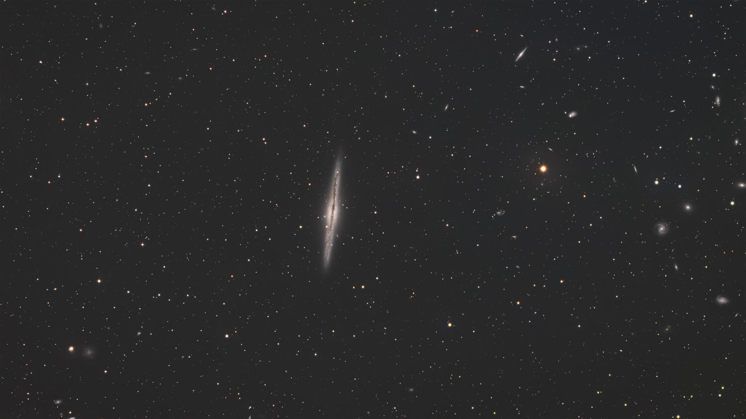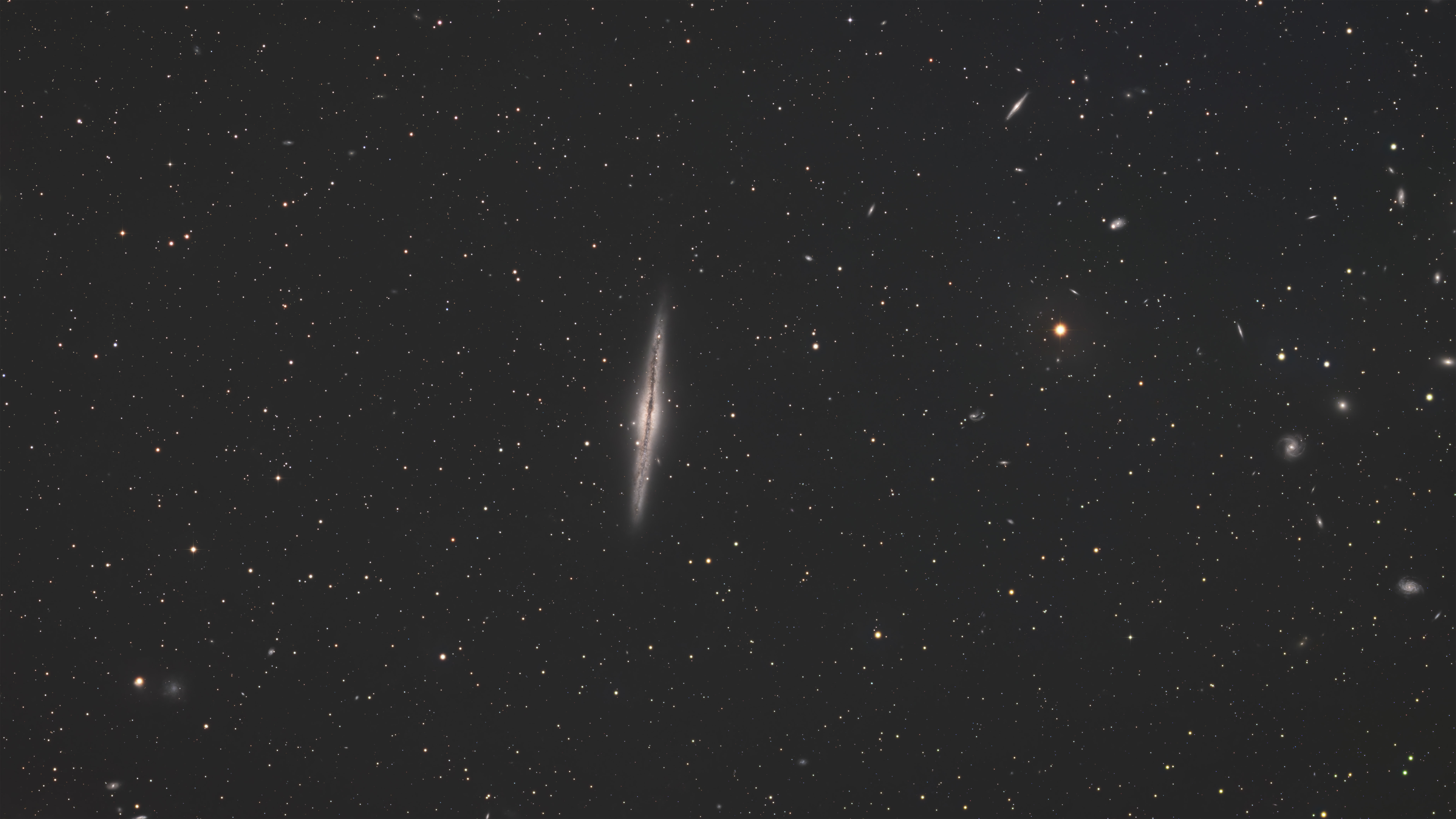 Bonjour les gens ! N'ayant pas eu le temps depuis mon dernier post le mois dernier (gousse d'ail), j'ai fini par traiter ma galaxie NGC 891 dans son champ, prise mi-décembre 2025, sur plusieurs jours (du fait du temps ou autres cibles en parallèle). Par morceaux, j'ai donc accumulé environ 5h30 de L (et 35mn de chaque R/G/B). Traitement assez simple et peu original siril/sirilic en prétraitement pix ensuite finalisation PS. Cliquez sur la full, pas mal de monde dans le champ, à droite en outre !