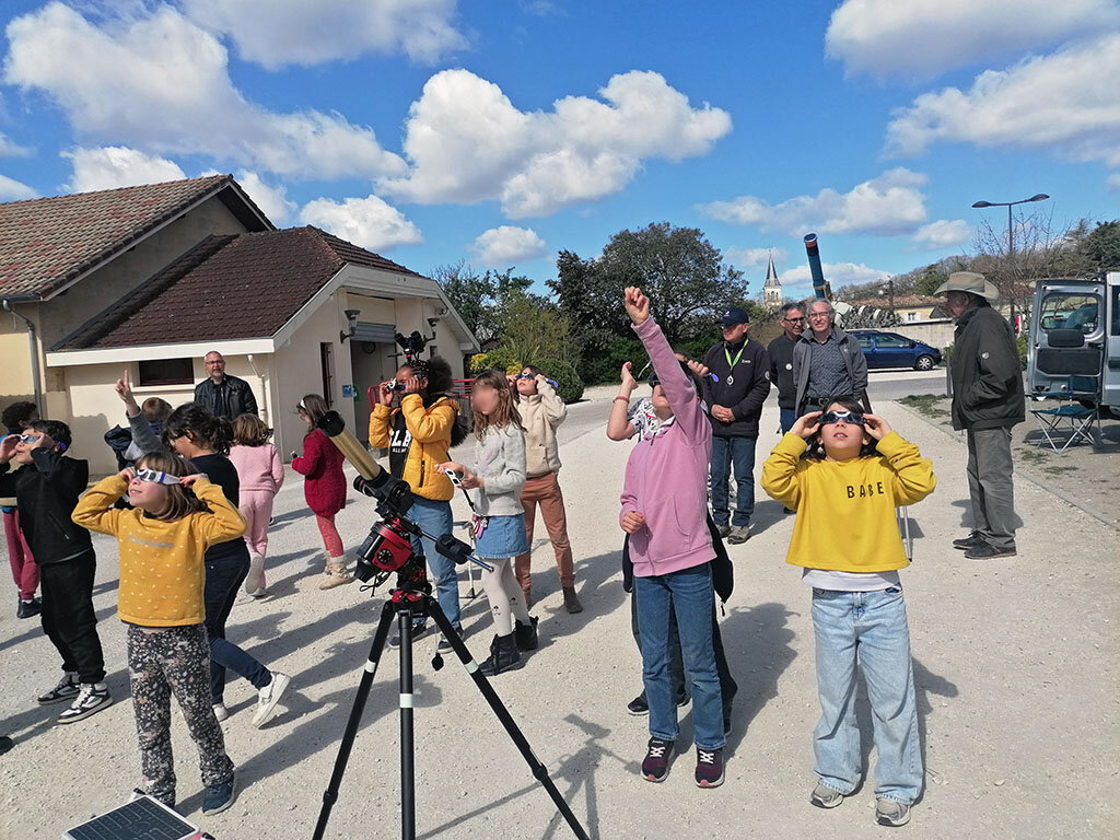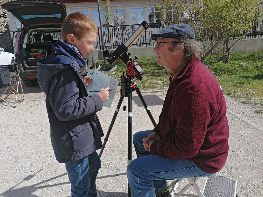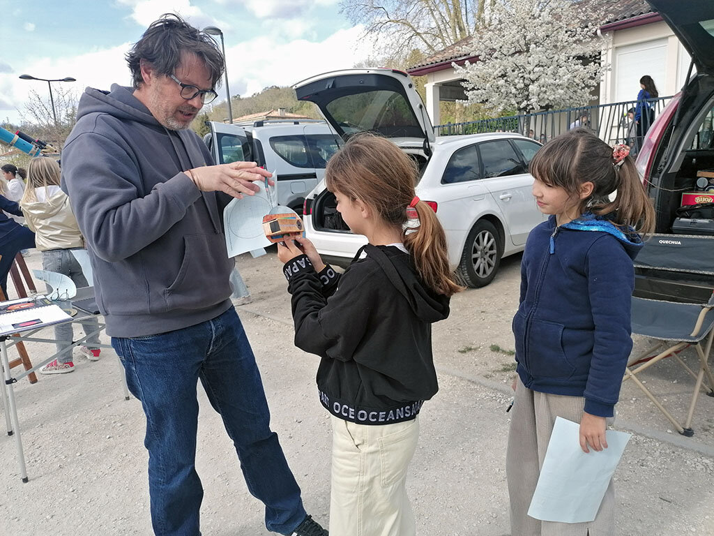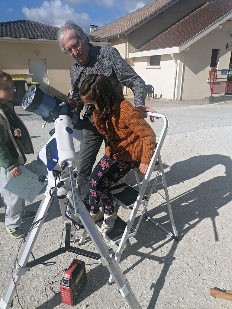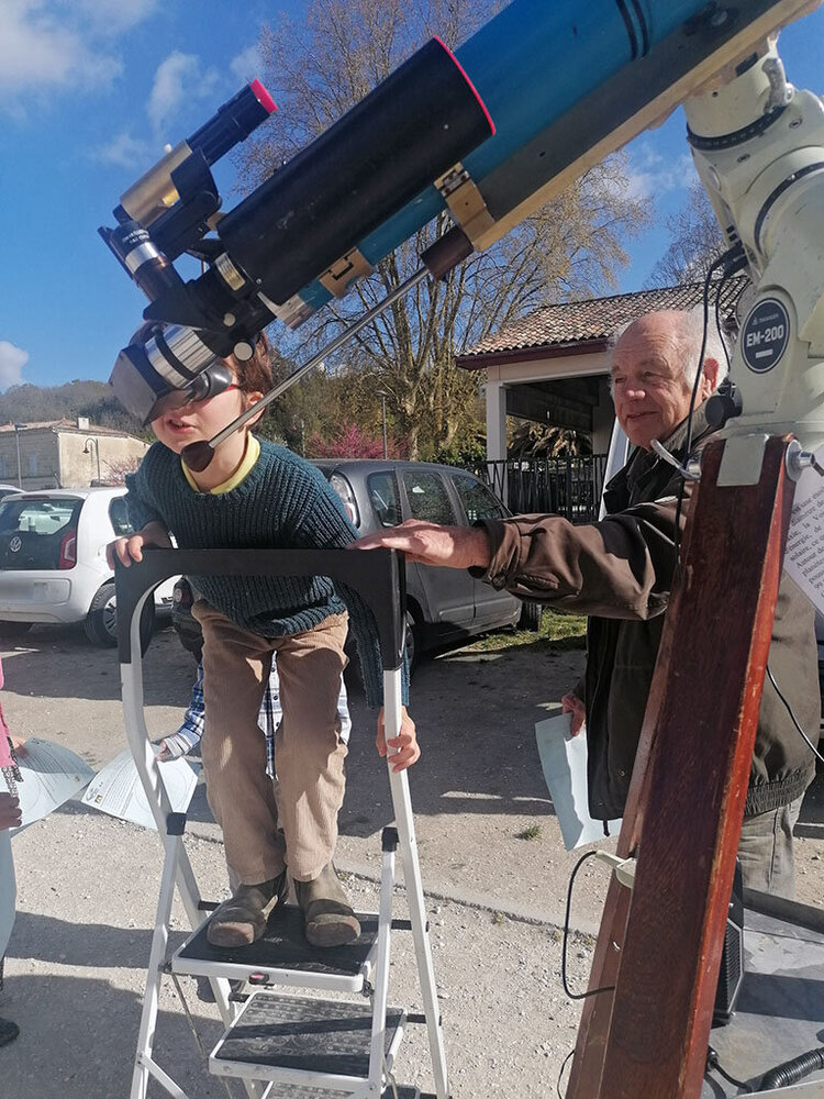 Le jeudi 26 mars, après de nombreux reports dus aux conditions météo, les bénévoles d’ASTRONOMIE GIRONDE 33 ont pu offrir une autre vision de notre étoiles aux enfants de l’école primaire de Lestiac-sur-Garonne (33). Quatre classes se sont succédées tout au long de la journée pour découvrir le soleil grâce aux instruments d’observation protégés par des filtres. Un jeu leur a été proposé afin d’en apprendre un peu plus sur la future éclipse de soleil du mois d’août, mais aussi sur le système solaire. Ils ont répondu aux questions et dessiné les taches et éruptions du jour et ont, au final, gagné, toutes et tous, une paire de lunette à éclipse. A midi, la cantine de l’école a offert un excellent repas aux six animateurs. Quelques photos de la journée : -