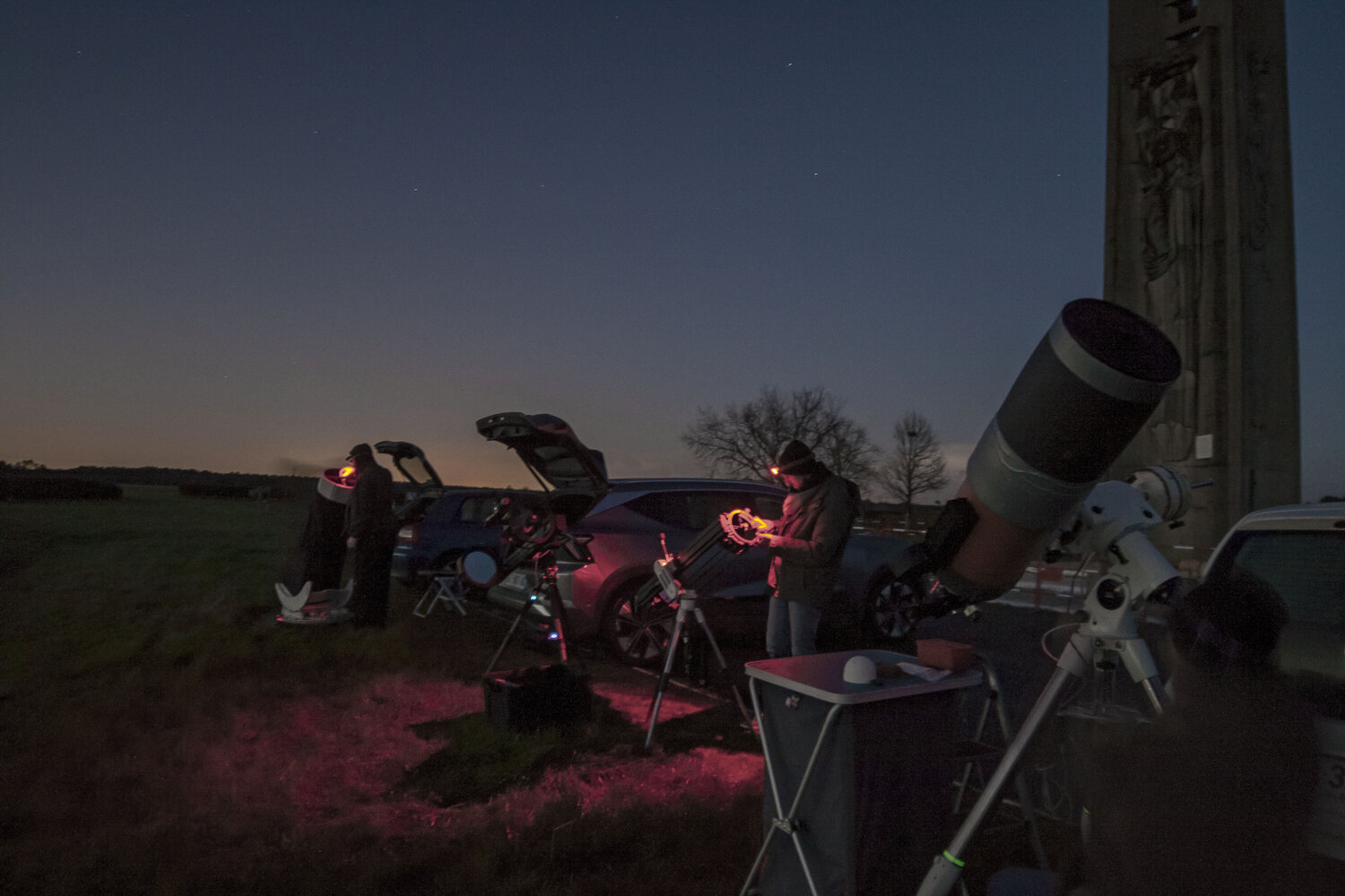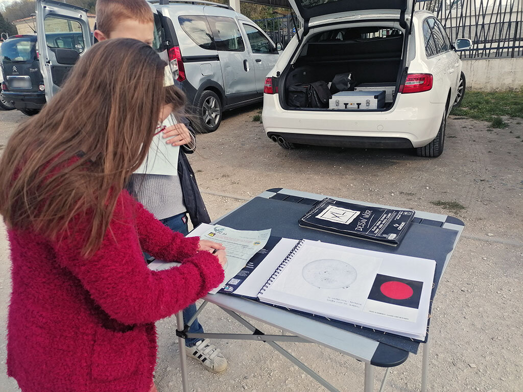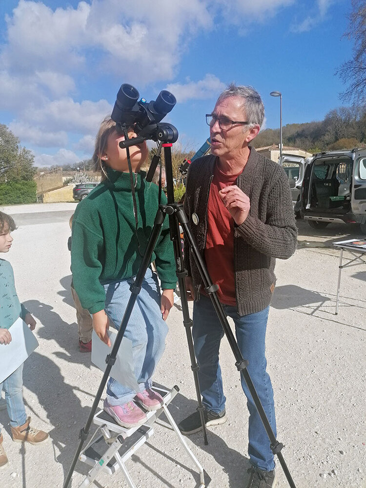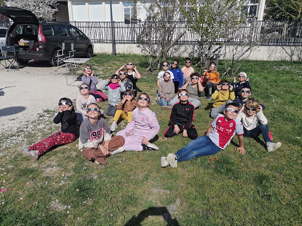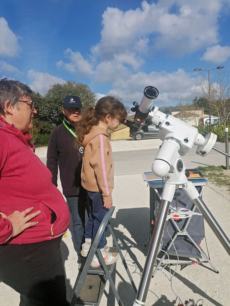 Le jeudi 26 mars, après de nombreux reports dus aux conditions météo, les bénévoles d’ASTRONOMIE GIRONDE 33 ont pu offrir une autre vision de notre étoiles aux enfants de l’école primaire de Lestiac-sur-Garonne (33). Quatre classes se sont succédées tout au long de la journée pour découvrir le soleil grâce aux instruments d’observation protégés par des filtres. Un jeu leur a été proposé afin d’en apprendre un peu plus sur la future éclipse de soleil du mois d’août, mais aussi sur le système solaire. Ils ont répondu aux questions et dessiné les taches et éruptions du jour et ont, au final, gagné, toutes et tous, une paire de lunette à éclipse. A midi, la cantine de l’école a offert un excellent repas aux six animateurs. Quelques photos de la journée : -