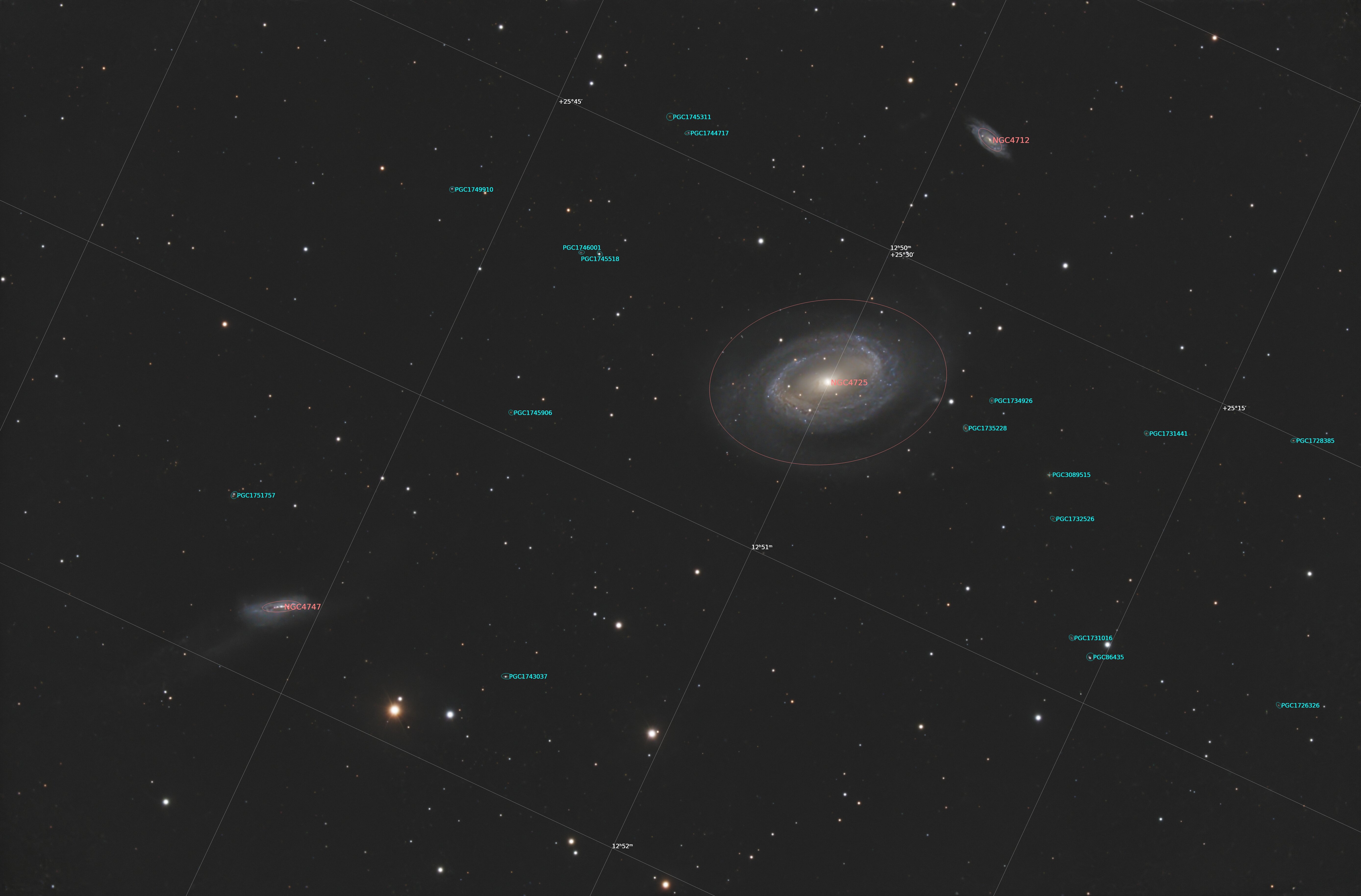 Hello, donc hier soir nouvelle nuit claire et j'avais décidé de reprendre NGC4725 déjà imagée l'an passé (j'adore cette galaxie!) Donc j'ai pu intégrer en gros 5h par pose de 60s au C8 à F/6.3 et Altair 26C. Et j'ai profité d'ajouter les 5h de l'an passé pour un totale de 10h en RGB sans filtre en ville. Alors ça fait bcp c'est vrai mais je récupère ainsi l'extension de NGC4747 qui était assez faible l'an passé. En ville et à F/6.3, ce genre de choses faible c'est pas facile 😞 En tout cas, c'est bien mieux ainsi et j'ai décidé de tenter une couche Ha ce soir pour voir avant l'arrivée d'un voile. (on verra bien). Voilà l'image et si Ha OK, un update demain ! 🙂 A+ Sam Version annotée