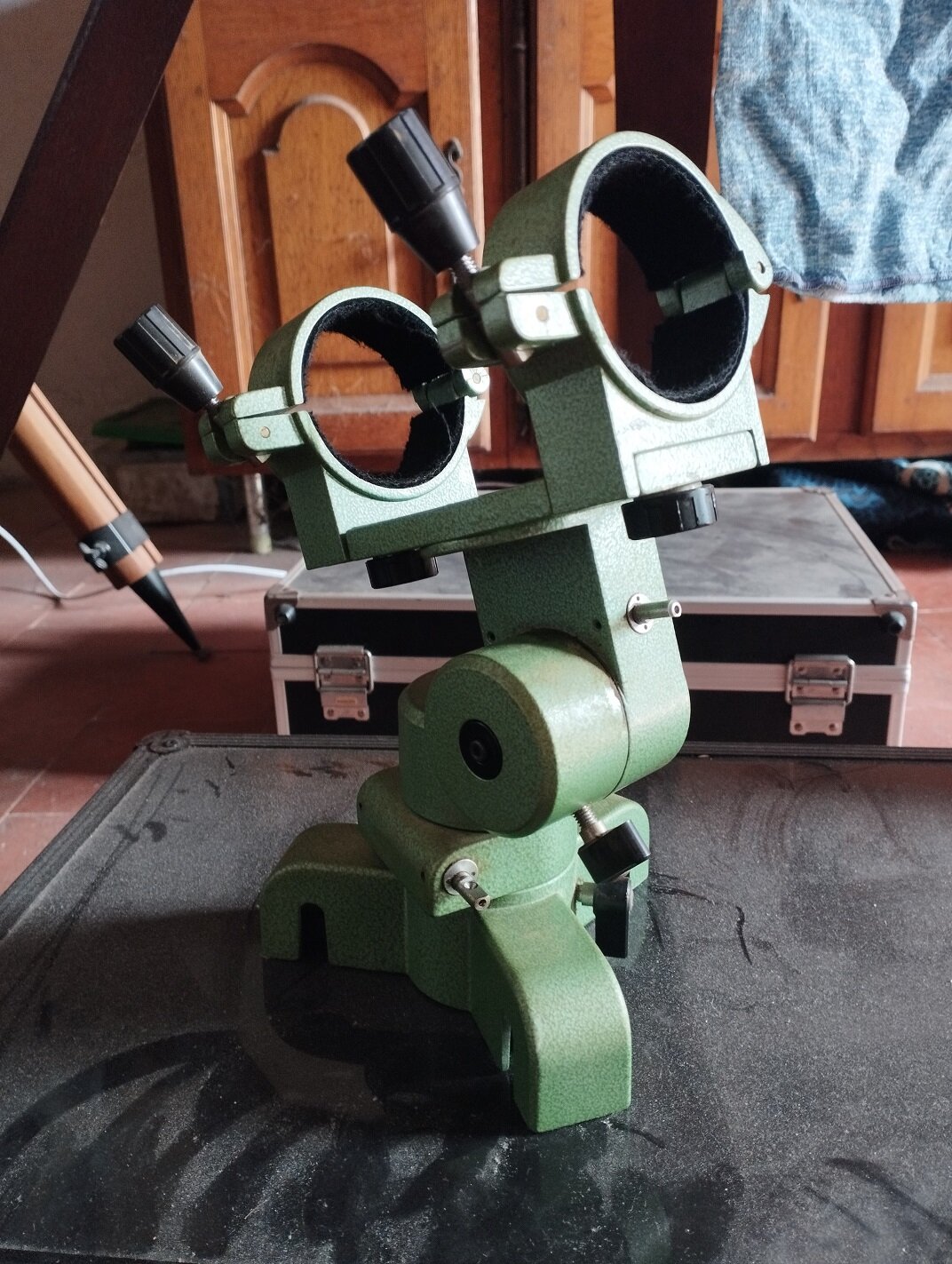 Salut Petite histoire que j'avais envie de raconter, rien de bien folichon mais c'est pour passer le temps. Il y a peu, j'ai acheté un instrument au Japon : Une lunette d'initiation 60/700. Pourquoi acheter ca au Japon alors qu'il y en a des tonnes en France? me direz vous. Et bien car c'est une 60/700 extremement rare et literallement introuvable en France. meme aux Usa, les collectionneurs galerent a la trouver. La seule que j'ai vu en vente en France, c'etait le tube optique seul et il etait vendu a 220 euros. (Oui oui, 220 euros pour un tube de 60/700 et il s'est vendu. je vous laisse imaginer la rareté du truc) Mais j'ai reussi a trouver l'instrument complet sur un site japonais. Trepied, monture et tube avec le renvoi coudé. Les seul pieces manquantes semblent etre le chercheur et les oculaires. Par contre, je ne dirais pas de quel modele il s'agit, c'est a vous de le deviner d'apres la piece que j'ai recu J'ai donc acheté mais une chose me chifonne lorsque la lunette arrive chez l'expediteur. (l'expediteur a l'international n'est pas le vendeur mais une sorte de depot qui sert d'intermediaire entre l'acheteur et le vendeur) Car le souci qui se presente c'est qu'ils me disent avoir recu le colis et qu'il est pret a partir chez moi, je paye mais les services proposés ne sont pas assez cher pour le poids de l'instrument (8 kilos, normalement c'est plus de 100 euros de frais de port avec ce poids) La je ne paye que 40 euros de frais de port. Le colis est expedié et le lendemain, je vois apparaitre exactement le meme colis comme n'etant pas expedié et ayant un prix d'envoi a 140 euros. Grosse confusion chez moi, j'ai un colis d'expedié et exactement le meme annoncé comme n'etant pas expedié. Pourquoi deux colis? je n'ai acheté qu'un seul instrument. s'agit il d'un bug? Je decide donc de ne rien faire et d'attendre l'arrivé du colis afin de voir si c'est un bug de leurs site ou si un probleme est survenu. Je recoit le colis : grosse panique, le colis est bien trop petit et trop leger pour etre un instrument complet. La fille du guichet postal a meme vu mon visage qui se decomposait d'inquietude et s'est sentie tres mal en pensant que je venait d'etre victime d'une arnaque. Je rentre a la maison, je deballe le colis et... c'est la monture. Seule... Sans trepied, sans molette, sans rien. La monture en question. D'un coté je suis rassuré car il n'y a pas d'erreur et donc le deuxieme colis encore au Japon est le reste de la lunette. D'un autre coté, je suis enervé car il n'etait mentionné nul part que l'instrument etait en deux colis et que j'allais devoir me taper deux fois des frais de port et taxes d'importations. Bref, tout ca pour dire que j'ai donc recu la monture. Elle va necessiter un bon regraissage car sa graisse d'origine est collante. Et oui, c'est bien une monture azimutale de 60/700, on est sur un truc bien plus massif et solide que les montures AZ chinoise toutes freles dedié a ce type de lunette. Voila, c'etait 3615 ma vie et mes deboires, sur ce, je vous souhaite une bonne journée et moi je vais pleurer a l'idée de payer pour un deuxieme colis. Alors, etes vous capable de deviner de quel instrument il s'agit a partir de sa monture? -