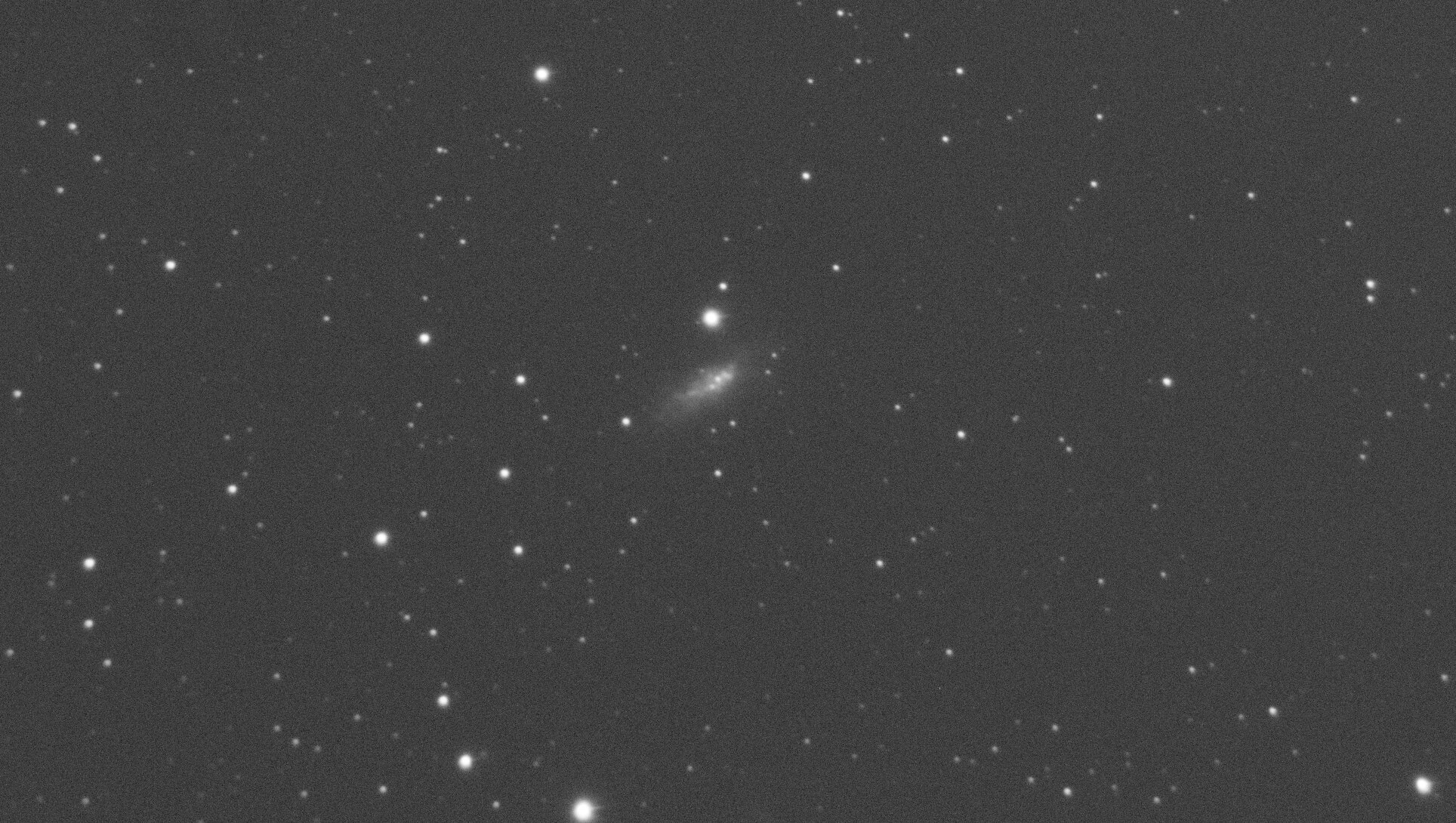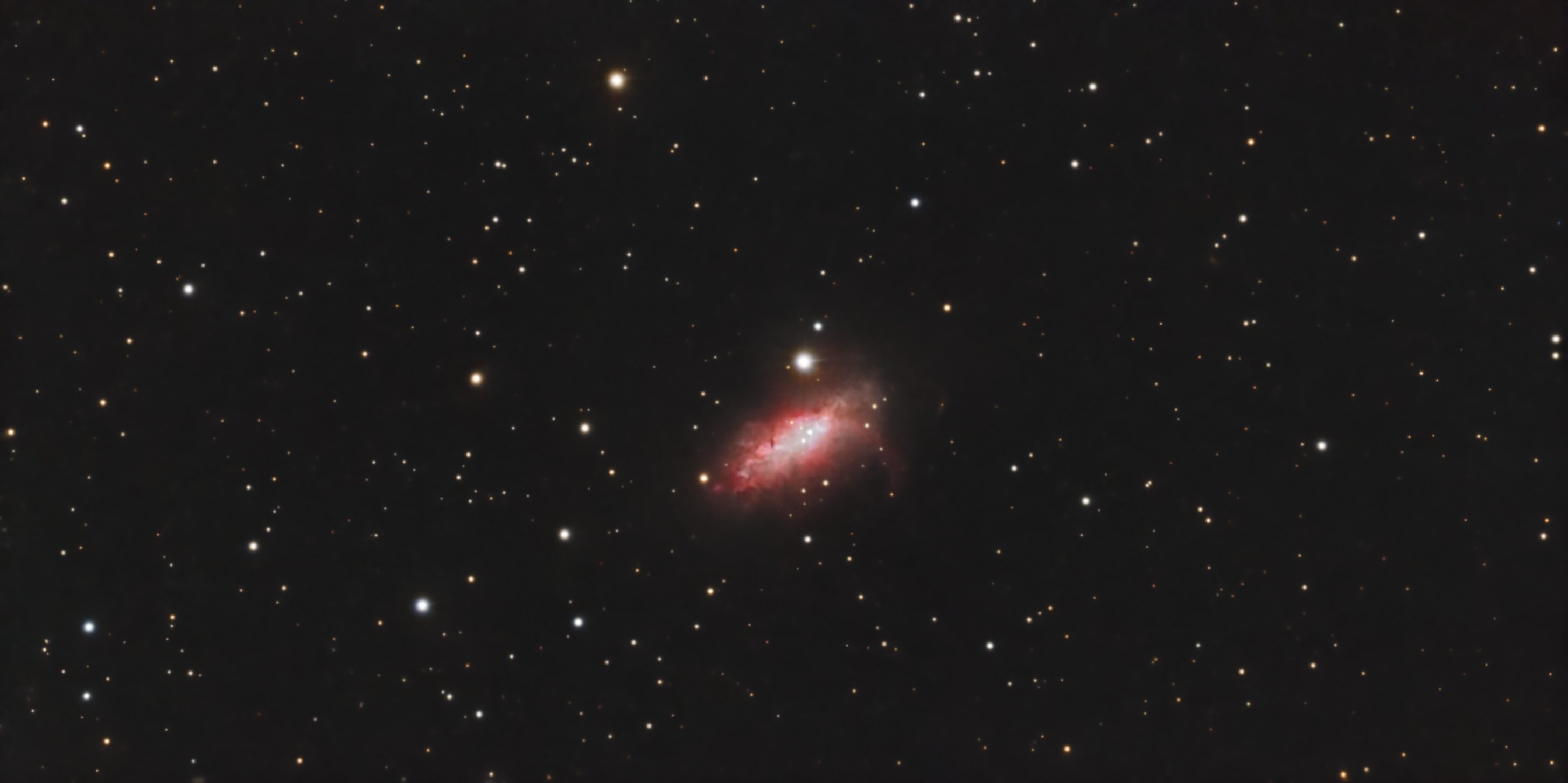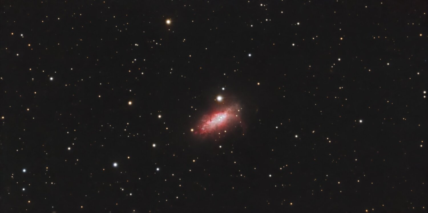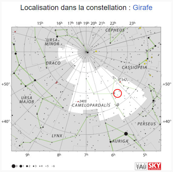 Hello, Ce n'est pas encore la saison des galaxies mais du côté de la Girafe, y a de quoi chasser. NGC 1569 est une petite galaxie irrégulière située dans la constellation de la Girafe à environ 10 millions d'années-lumière de la Voie lactée. Elle a été découverte par l'astronome germano-britannique William Herschel en 1788. NGC 1569 a été utilisée par Gérard de Vaucouleurs comme une galaxie de type morphologique IB(s)m dans son atlas des galaxies. La classe de luminosité de NGC 1569 est V-VI et elle présente une large raie HI. C'est aussi une galaxie active de type Seyfert 1 et c'est une galaxie à sursauts de formation d'étoiles. Cette galaxie est une cible de choix pour les astronomes professionnels, car elle est si près de nous que le télescope spatial Hubble peut résoudre individuellement ses étoiles. On peut ainsi réaliser des études poussées sur près d'une cinquantaine d'amas qu'elle renferme. La principale caractéristique de NGC 1569 est son taux de formation d'étoiles extrêmement élevé. Au cours des 100 millions d'années passées, des étoiles y sont nées à rythme 100 fois plus élevé que celui de la Voie lactée. Cette galaxie renferme deux superamas stellaires, le superamas A situé au nord-ouest et le superamas B situé près du centre. Ces deux superamas ont connu des épisodes différents de formation d'étoiles. Le superamas A est en réalité constitué de deux amas rapprochés : NGC 1569 A1 et NGC 1569 A2. Ils contiennent de jeunes étoiles dont des étoiles de type Wolf-Rayet qui se sont formées il y a moins de 5 millions d'années dans NGC 1569 A1. NGC 1569 A2 renferme également de plus vieilles étoiles de type supergéante rouge[14],[8],[16]. Le superamas B contient une population plus âgée de géantes rouges et de supergéantes rouges. Ces deux superamas stellaires auraient des masses comparables à celles des amas globulaires en orbite dans le halo de la Voie lactée, soit approximativement entre 600 000 et 700 000 M⊙. Plusieurs autres amas d'étoiles plus petits ont aussi été aussi observés. La masse de certains d'entre eux est semblable à celle des petits amas globulaires de la Voie lactée ou à celle de R136a dans le Grand Nuage de Magellan. De jeunes étoiles dont l'âge varie entre 2 millions et 1 milliard d'années ont été observées dans ces amas. Plusieurs supernovas dans cette galaxie ainsi que les forts vents stellaires ont donné naissance à des filaments et des bulles d'hydrogène ionisé, dont les tailles respectives atteignent 3,7 et 380 années-lumière. Sur les images captées par les grands télescopes, ces filaments et ces bulles excités par la lumière des jeunes étoiles brillent intensément. On pense que les sursauts de formation d'étoiles de NGC 1569 proviennent de l'interaction gravitationnelle avec les autres galaxies du IC 342/Maffei, mais plus probablement avec un nuage rapproché d'hydrogène neutre. Certains pensent que la galaxie irrégulière naine UGCA 92 est une compagne de NGC 1569, mais la relation de celle-ci avec les sursauts de formation d'étoile n'est pas établie. Des auteurs suggèrent que UGCA 92 n'est pas à l'origine de ces sursauts, alors que d'autres suggèrent qu'elle interagit avec NGC 1569 par une queue de marée gravitationnelle et plusieurs filaments d'hydrogène neutre. Cependant, il se pourrait que ces filaments soient à l'intérieur de la Voie lactée plutôt qu'être associés à UGCA 92. SCT Celestron C8 (203/2000) focale @ 1897mm f/d 9.3 Caméra QHYminicam8 mono Monture HEQ5 kit courroie Rowan Autoguidage via lunette guide 60/270, Asi290mm / PHD2 Acquisition NINA L= 89 x 60s R= 30 x 60s G= 28 x 60s B= 29 x 60s Ha= 31 x 180s OIII= 29 x 180s Mode Full Resolution Gain 82 offset 30 T° -10°C Pré-raitement Sirilic/Siril , Pixinsight. SetiAstroSuite Pro. Une brute de 60s filtre L: -
