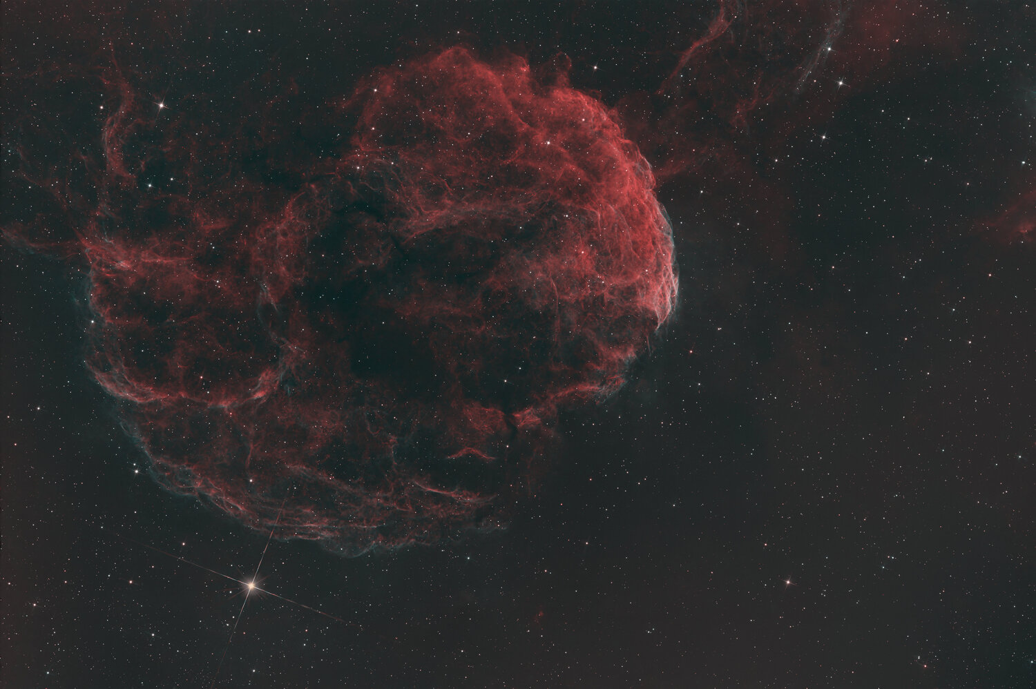IC 443, également connue sous le nom de nébuleuse de la méduse ou Sh2-248, est un rémanent de supernova situé dans la constellation des Gémeaux, à proximité de l'étoile η Geminorum (Tejat Prior ou Propus), de magnitude 3,3. Ce vaste nuage de débris en expansion, résultant de l'explosion d'une étoile massive il y a environ 25 000 à 35 000 ans, couvre une surface d'environ 1,5 fois le diamètre apparent de la Lune, soit une taille angulaire de 45 minutes d'arc. Sa distance à la Terre est estimée à environ 5 000 années-lumière, bien que certaines études proposent des valeurs variant entre 2 800 et 8 000 années-lumière. IC 443 présente une structure complexe, avec des lobes asymétriques et une source compacte centrale, probablement un pulsar. ça fait un moment que je voulais la faire cette méduse Hier soir 28-12 de 20h00 à 0h00 (les nuages sont arrivés en force d'un seul coup) On voit bien je trouve le OIII malgré la lune 72x180s / L-Ultimate / ONTC 200/930mm Pré-traitement WBPP avec Drizzle x2 Version HOO avec pixelmath Etirement avec Veralux puis StarXT (je préfère une fois l'image étirée), GHS je n'y arrive pas correctement ... Passage en TIFF 16 bits puis Photoshop avec luminance synthétique + niveaux + cameraraw pour gérer les textures et les corrections diverses (notamment le halo de Propus) Assemblage Stars + starless sous PS Utilisation de IntegerResample sous Pixinsight pour revenir à la taille origine sans perdre les avantages du drizzle (enfin normalement ...)