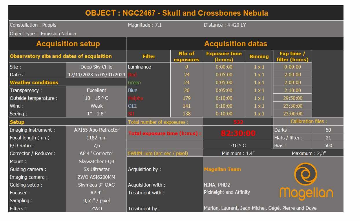 Salut les astrams 😀 Nous vous présentons cette fois la Nébuleuse du crâne, NGC2467, photographiée depuis Deep Sky Chile. Située dans la constellation de la Poupe, NGC 2467 est l'une des régions de formation d'étoiles les plus actives du ciel austral. Elle se trouve dans une zone dense de la Voie Lactée, riche en gaz et en amas. Elle a été découverte par William Herschel le 9 décembre 1784. Évaluer la distance de NGC 2467 est un exercice complexe car il ne s'agit pas d'un objet isolé, mais d'une superposition de plusieurs groupes d'étoiles situés à des profondeurs différentes sur notre ligne de visée : · Le complexe principal : On estime généralement que le cœur de la nébuleuse se situe entre 13 000 et 17 000 années-lumière. · Les amas imbriqués : L'amas Haffner 18 contient des étoiles situées à environ 15 000 années-lumière, tandis que d'autres structures en arrière-plan (comme Haffner 19) s'étendent jusqu'à 21 000 années-lumière. · Premier plan : Certaines étoiles très brillantes visibles sur les clichés ne font pas partie de la nébuleuse et ne sont situées qu'à environ 4 500 années-lumière. Concernant les détails d’acquisition, ceux-ci sont consignés dans le tableau ci-dessous. Comme toujours nous vous recommandons d’aller voir la full sur Astrobin : https://app.astrobin.com/u/Magellan_Team?i=36ewes#gallery En espérant qu’elle vous plaise ! 😉 Ciel clair à tous 😀 Marian, Jean-Mi, Gégé, Laurent, Pierre et Dave