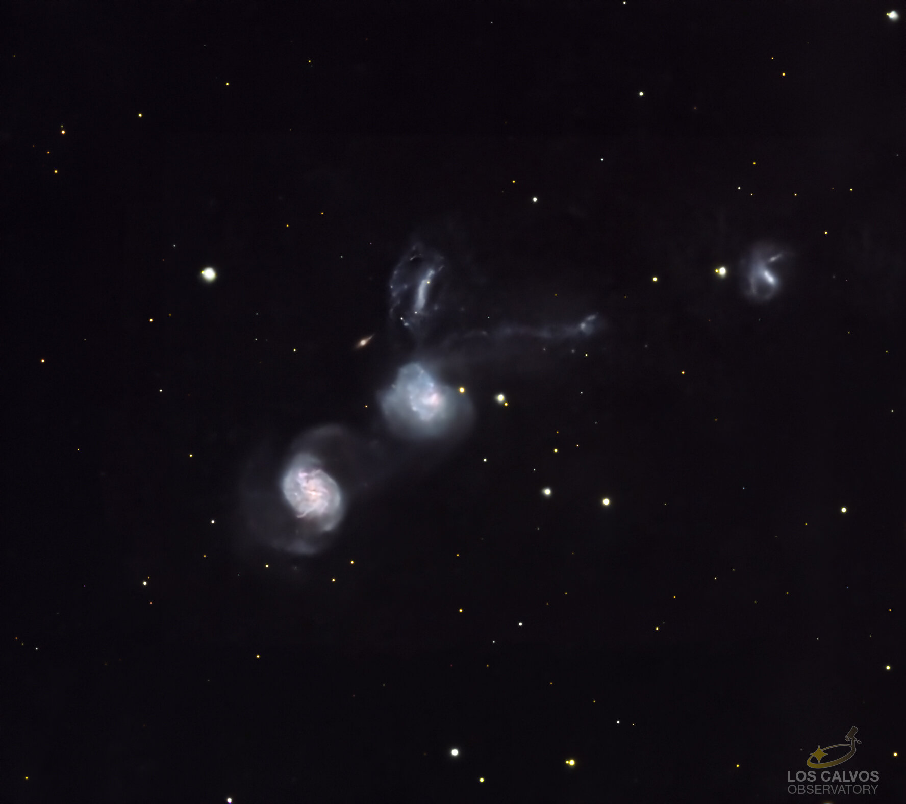 2. Pour la dernière image de 2025, nous vous présentons une très petite cible, l'ARP 314 dans le Verseau, située à environ 180 millions d'années-lumière. L’image est un drizzle non réduit et croppé. De gauche à droite, l'ARP est composée de : MGC-01-58-010 (ARP 314-1), MGC-01-58-009 (ARP-314-2) et MGC01-58-011 (juste au-dessus) (ARP 314-3), une queue faible menant de NGC 70130 à une galaxie naine LEDA1066529. La taille de ce groupe est inférieure à 10 minutes d'arc, avec 2 minutes d'arc entre les deux plus grandes galaxies. La galaxie Arp 314-1 présente une structure en spirale avec plusieurs nœuds bleus brillants clairement associés à des régions de formation stellaire. Le noyau est dominé par une forte émission ponctuelle. La périphérie de la galaxie présente une émission stellaire diffuse en forme de structure en coquille. Compte tenu de leur proximité (∼39 arcsec du centre d'Arp 314-1), ces coquilles devraient être formées par une interaction entre Arp 314-1 et Arp 314-2, comme le montrent les simulations de galaxies en interaction. Par exemple, Hernquist & Quinn (1989) ont suggéré que des structures en coquille peuvent se former lors de l'interaction entre une galaxie à disque de faible masse et une galaxie à disque plus massive. La galaxie Arp 314-2 présente une morphologie extrêmement perturbée (voir figure 1), sans structure spirale détectable, et on observe qu'un bras de marée émergeant du côté sud-est de la galaxie apparaît également dans ce cas. Plusieurs régions de formation stellaire peuvent être observées à travers le corps principal de cet objet. On observe en particulier trois nœuds brillants près de son centre, avec une émission stellaire diffuse vers le nord-ouest de ces régions. La région 28-1 est située à environ 14 arcsecondes du centre d'Arp 314-2, tandis que les régions 28-2 et 28-3 sont situées à environ 1 arcseconde du centre d'Arp 314-2. Sur le côté sud-est d'Arp 314-2, il existe une queue de marée optique étendue contenant un certain nombre de nœuds compacts. En outre, nous observons une émission stellaire diffuse et faible entre Arp 314-1 et Arp 314-2, qui contient une chaîne de sources compactes et semble relier les deux galaxies. Enfin, Arp 314-3 présente une forme irrégulière. Sa morphologie révèle la présence d'une barre stellaire entourée de plus d'une douzaine de régions de formation stellaire. La morphologie de cette galaxie ressemble à celle du LMC. Full and details on astrobin : https://astrob.in/0tk03x/0/ URGENT : ce set-up installé au Chili à l'observatoire El-Sauce est A VENDRE, si intéressé merci de contacter rediger@hotmail.fr