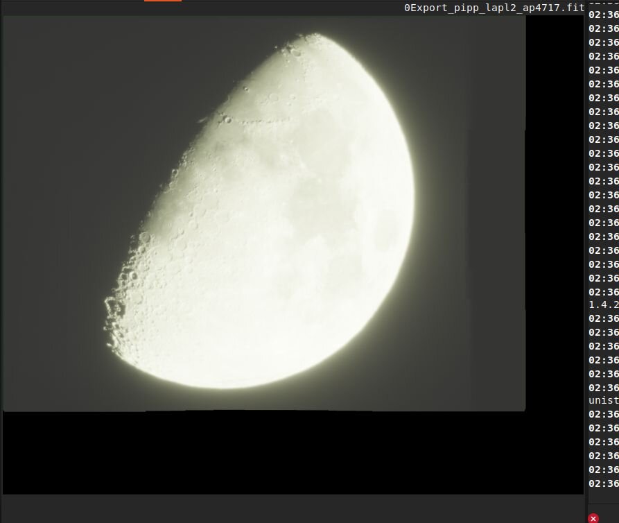 Bonjour, je m'essaie depuis peu à l'imagerie lunaire en processant les images brutes fournies par mon télescope Unistellar Odyssey - pas spécifiquement conçu pour ça, donc. Voici mon flux de traitement : 1. Dans Siril, dématriçage des fichiers FITS et export de la séquence au format SER 2. Dans PIPP, préprocessing de la séquence 3. Dans Autostakkert, alignement de la séquence 4. Dans Siril, suppression du bruit vert sur l'empilement et export au format TIFF 5. Dans Astrosurface, traitement par ondelettes Pour info, j'ai un portable Acer Swift 5 de 2020 avec un processeur Intel i5 et 8Go de RAM, qui tourne sous Linux. Mon premier essai était plutôt réussi (première image jointe). Mais je rencontre 3 problèmes : 1. Je n'arrive pas à faire de Drizzle (*1.5 ou *3) sur la Lune, a priori pour un manque de RAM : existe-t-il un moyen de contourner cette limitation ? 2. Après pre-processing dans PIPP, AutoStakkert ouvre la séquence en y ajoutant une "marge" (en rouge dans la deuxième image jointe). Cela a pour effet de recadrer la séquence et je dois donc augmenter la taille de l'image pour récupérer tout le champ. Après traitement, je retrouve cette marge dans l'empilement (troisième image jointe). 3. Sur ma dernière capture, Autostakkert n'arrive pas à empiler correctement la séquence (quatrième image jointe). Sur cette séquence de 105 images, PIPP en a écarté 12, mal cadrées. Merci d'avance pour vos lumières sur ces points. -