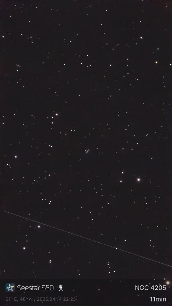 12. Bonjour, Une fenêtre sur le ciel et sn2026 fvx a été imagé avec le S50 pendant 11min. Elle est donnée à magn 13,1 (cobs à 435nm, 11,2 en IR 1,2µm). Donc accessible facilement avec 50mm. Petit objet que NGC4205 avec 250mm de focale mais la SN est bien visible. Les conditions: ciel parisien voilé de cirrus d'altitude. Voici l'acquisition: A suivre.