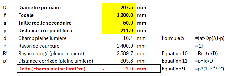 24. Mise à jour. Pour le calcul de l'offset, je me suis servi des formules de Serge Bertorello. Avec les données : D = diamètre du primaire = 207.5 mm f = focale du primaire = 1200 mm p = distance axe optique primaire vs point focal à l'oculaire = 158 + 45 + 8 = 211 mm a = diamètre du secondaire = 50 mm Avec ces valeurs, le champ pleine lumière fait 16.4 mm (équation 5 sur cette page). Et en utilisant les équations 9, 10 et 11 j'arrive à un delta de 2 mm à appliquer dans les deux directions vers le primaire et à l'opposé du secondaire) :
