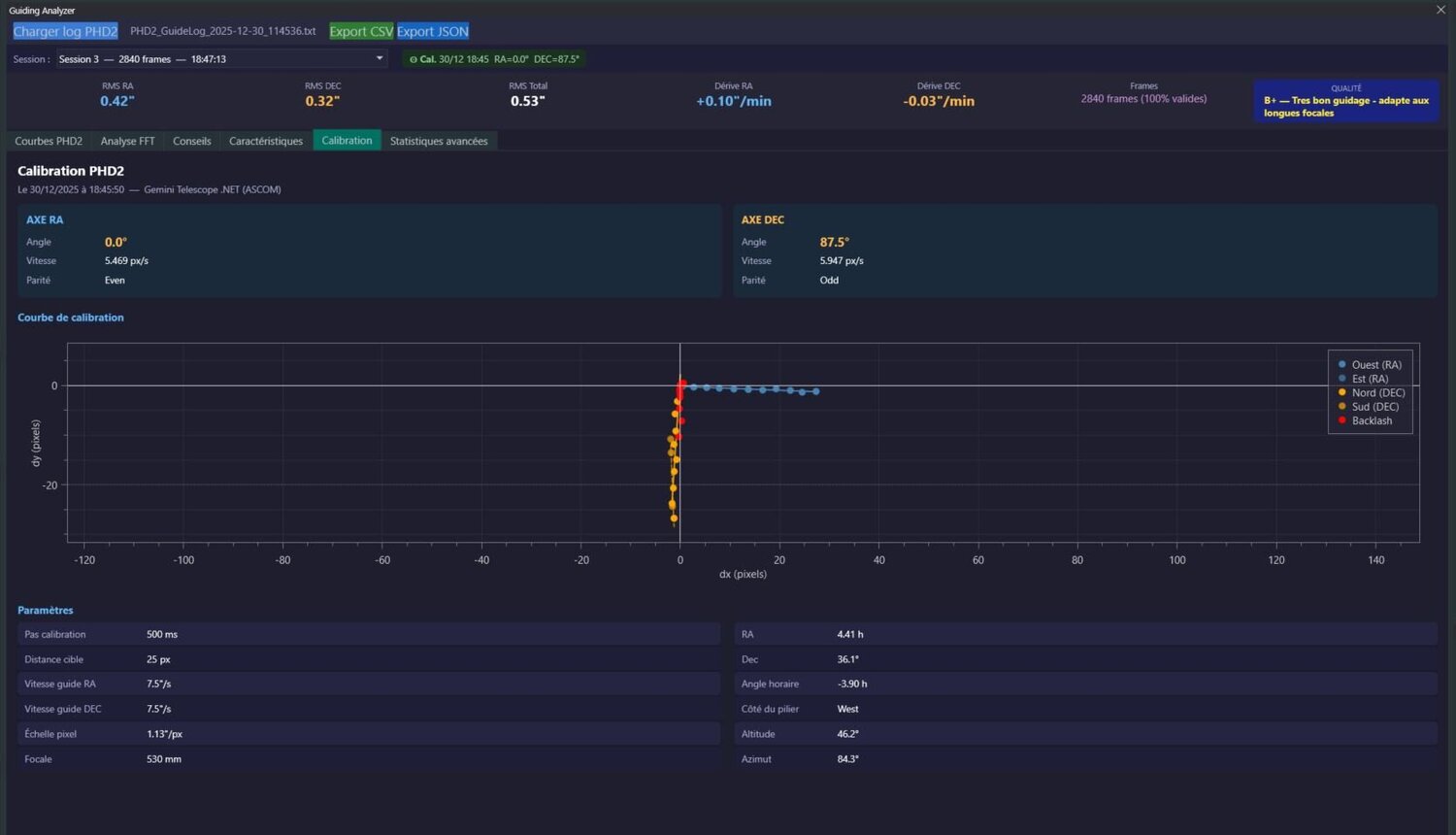 yes, désolé mais mon plugin est assez basic et non révolutionnaire (et je ne suis pas un grand bavard 😉). Mais oui une petite présentation 😉 Donc il lit les fichiers de guidage issus de phd2, donc après une session. On choisit son fichier et sa session (par défaut je prends la plus grande) il y a 6 onglets : Courbes PHD2: il retrace la courbe de guidage et il recalcul la courbe de la monture hors correction de guidage. Sur la courbe reconstituée on peut mieux voire l'amplitude de la monture. Il y a un bouton "Drift correction" qui remet la courbe à plat. J'ai un souci avec ce drift, car en fait il inclut une composante réfraction, une composante monture et une composante erreur de mise en station, voire d'orthogonalité. Je vais essayer dans une prochaine version d'arriver à démêler tout ça. (J’ai encore un petit bug avec la reconstitution de la courbe) Analyse FFT: Simple transformation de Fourier pour en ressortir les fréquence sou il se passe des choses sur la monture. là aussi il est possible de la calculer sur la courbe reconstituée Conseil : j'ai essayé de proposer des conseils, ou plutôt des points de vigilance en fonction de différents calculs que l'on peut faire sur une session de guidage Caractéristiques : on ne fait ici que présenter ce que PHD2 écrit dans les logs Calibration : ici on affiche la session de calibration qui précède la session de guidage Statistiques avancées : là j'ai essayé de me lâcher ! Distribution des erreurs : Skewness: on recherche l'asymétrie de la distribution des erreurs, en gros on veut que ce soit symétrique donc 0 , Kurtosis: on recherche la fréquence des pics d'erreurs, là aussi on veut 0 sinon il y a un problème dans les engrenages, pearson: on calcul la corrélation des erreurs entre l'axe RA et DEC, on ne veut pas de corrélation donc 0, Stationnarité : je regarde si en deuxième partie de session il y a une dégradation ou pas Je recalcul la période de la VSF et compare avec PPEC de phd2 si cet algo est utilisé... ne sert à rien mais je voulais recalculer la période et c'est assez fiable ! J’ai essayé d'afficher le RMS versus altitude au cours de la session de guidage, cela permet de voir comment cela se dégrade ou pas le guidage Il y a des boutons d'export mais bof je vais peut-être les retiré, l'export JSON permet de récupérer des statistiques mais pas tout... J’oubliais : sur les graphiques : on zoom avec la molette de la souris et on déplace le graphique en restant appuyant avec le bouton gauche qq copie d'écran: