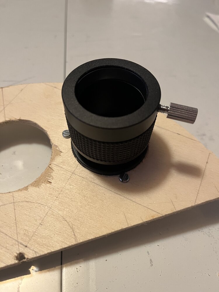 J’ai effectué un montage à blanc sur une chute de bois pour le porte oculaire. Ce PO (réf TSFOCH1 chez Teleskop Express) est vissé sur une platine T2 (réf TST2-T2). La platine d’origine a 2 trous à 180° pour la visser, ce qui est franchement mauvais car elle peut alors facilement bouger. J’ai donc percé 2 trous de 3 mm de diamètre de façon à avoir une fixation sur 3 points à 120°. Ça tient bien mieux. Le premier réflexe est de visser la platine au dessus de la planche et de visser ensuite le PO dessus. En faisant comme ça, la distance minimale entre l’axe du secondaire et la PO complètement rentré est de 140+5+1+45 =191 mm. Mais si on fixe la platine T2 de l’autre côté de la planche, la distance n’est plus que de 140+45=185 mm. On gagne 6 mm, donc moins de balourd latéral et un peu moins d’encombrement dans l’ensemble. Le trou à percer doit faire 45 mm de diamètre + un chouya pour que le PO rentre bien. Il faut ajouter des rondelles sous la tête de la tige filetée pour ne pas poinçonner le bois mais il faut les meuler un peu pour qu’elles ne gênent pas le PO. J’attends de recevoir toute la quincaillerie commandée pour faire le support du secondaire avant de coller et percer la planche du PO sur la cage du secondaire. Ca me permettra de bien ajuster l’ensemble à la bonne position.