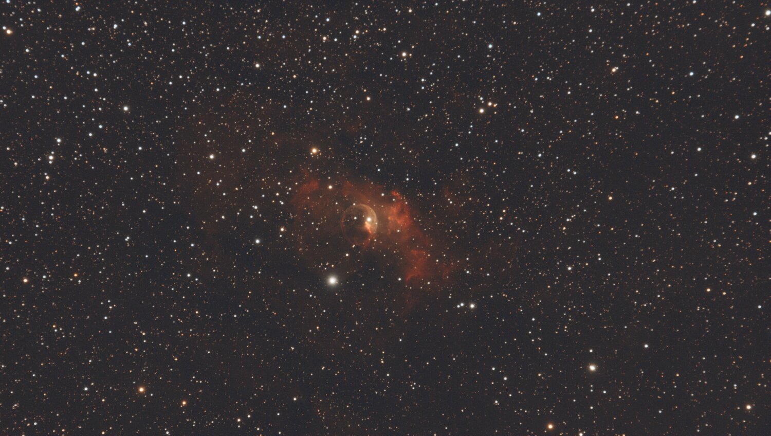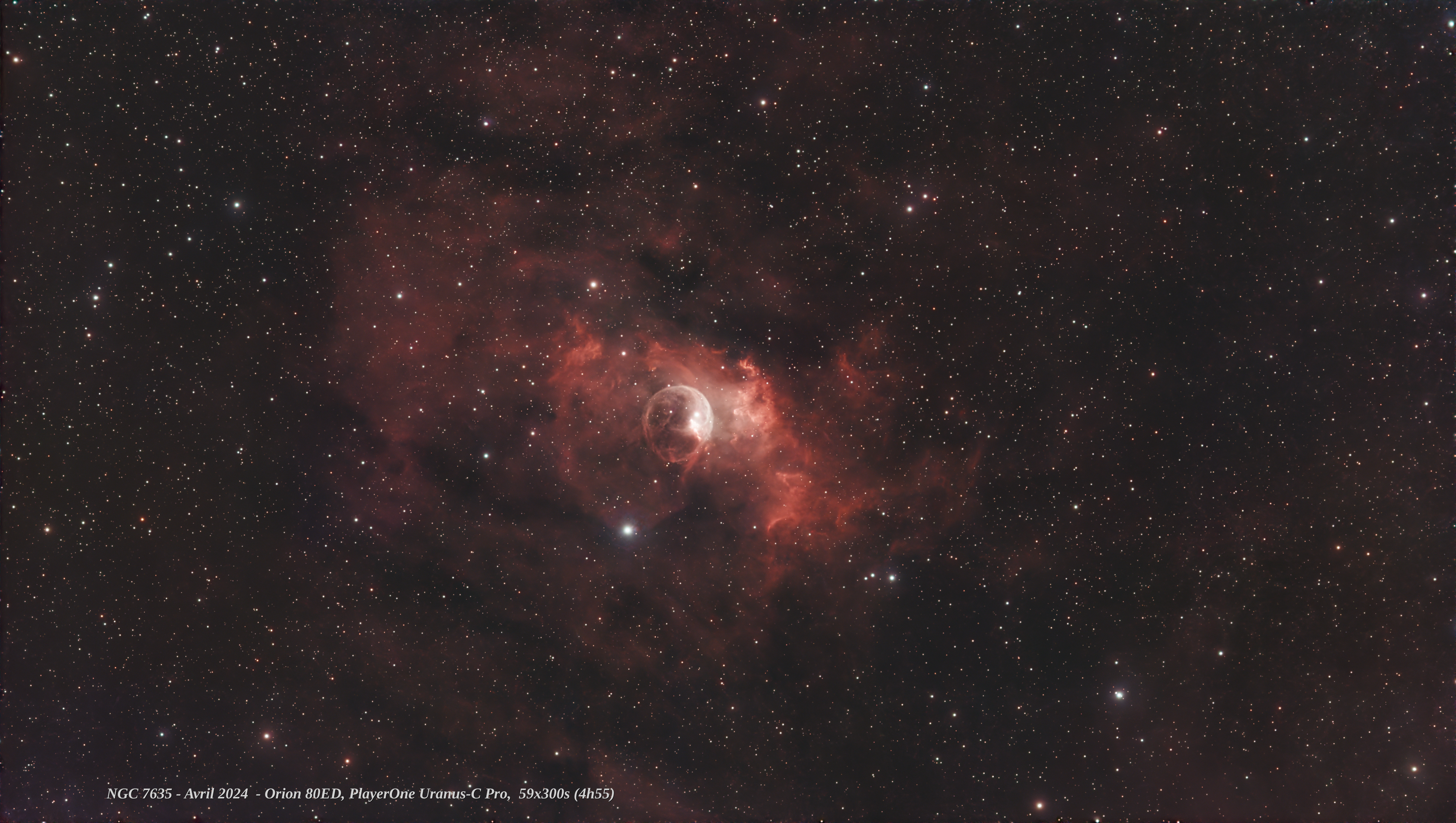 Salut Bien jolie Comme @Ant-1, je préconise un peu plus de 2h Avec le C8, il m'a fallu 3h20 pour avoir quelque chose d'à peu près buvable Le guidage est très important Je guide avec un OAG et C8 à pleine focale Je suis à Bortle 3, carrément à l'extérieur du village, pas de vis à vis, ni lampadaire Je suis sur une EQ6 R Pro également, j'essaie d'en tirer le meilleur Seule différence, j'utilise la 533 MC Pro pour l'imagerie
