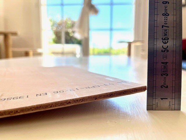 Autant les pièces en bois de chez Menuikit et Vexi étaient vraiment bien planes, autant celles d'Ilicut sont très voilées... C'est surtout le cas de celle dans laquelle je dois couper le pan coupé et les faces avant et arrière de la caisse du primaire, ou j'ai mesuré un voile de 2 cm sur une diagonale de 48 cm - autrement dit si j'appuie sur un angle de cette diagonale, l'autre se soulève de 2 cm ! Pour les autres, le voilage est de 1 à 3 mm, donc acceptable pour des pièces collées/clouées. PS. En arrière plan, on voit très bien Serge, le lama du voisin 😄